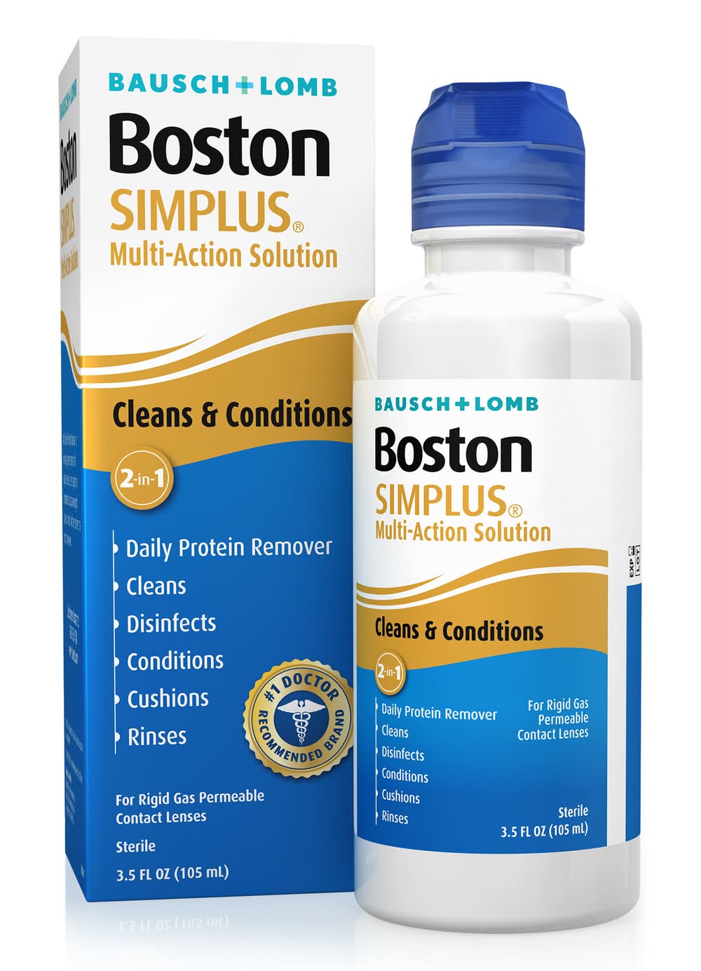 Boston SIMPLUS Multi-Action Contact Lens Solution, from the eye care experts at Bausch + Lomb, is a convenient one-bottle cleaning, disinfecting, and conditioning product that has the added convenience of a built-in protein remover. This formula's cleaning system removes dirt and deposits from your lenses without a separate daily cleaner, and the built-in protein removal system removes protein deposits daily. The disinfecting system destroys germs and the wetting and conditioning system retains moisture for optimal lens wearing comfort. To use, wash hands. Place lenses in empty lens case and fill to top ridges with fresh Boston SIMPLUS Multi-Action Solution. Soak lenses for 4+ hours or overnight before wearing. After soaking, wash hands and remove lenses from lens case and rub both sides of the lenses carefully with 4 drops of Boston SIMPLUS Multi-Action Solution in the palm of your hand for 20 seconds. Rinse with Boston SIMPLUS Multi-Action Solution and insert lenses. For full instructions, see information printed inside the product carton. For fluoro silicone acrylate and silicone acrylate rigid gas permeable contact lenses. Not for use with soft (hydrophilic) contact lenses. Bausch & Lomb, Rochester, NY, 14609