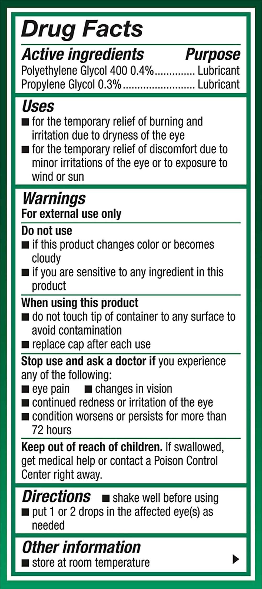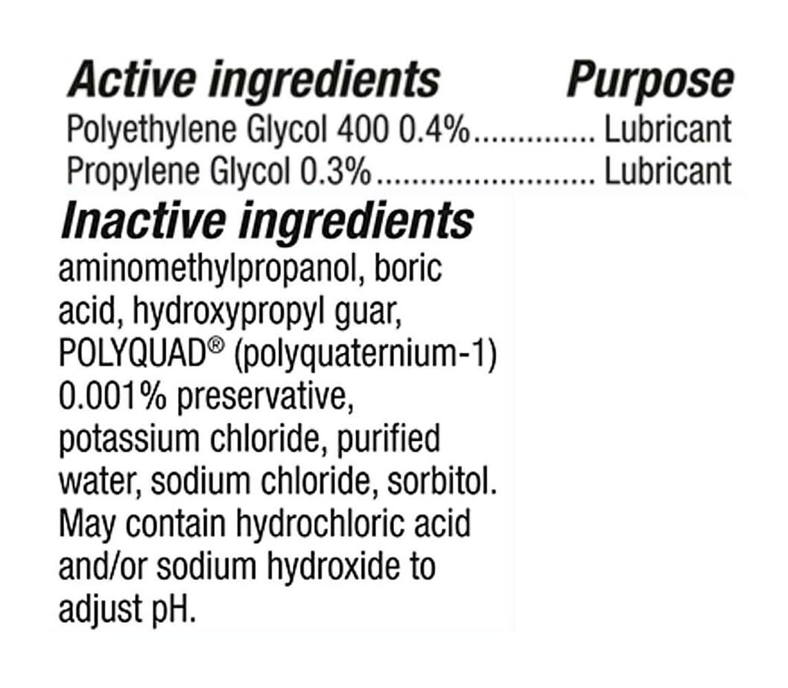 Ingredients: Active Ingredients: Polyethylene Glycol 400 (0.4 %), Lubricant; Propylene Glycol (0.3 %), Lubricant. Inactive Ingredients: Aminomethylpropanol, Boric Acid, Hydroxypropyl Guar, Polyquad (Polyquaternium-1) 0.001% Preservative, Potassium Chloride, Purified Water, Sodium Chloride, Sorbitol, May Contain Hydrochloric Acid and/or Sodium Hydroxide to Adjust pH Additives: Aminomethylpropanol, Boric Acid, Hydroxypropyl Guar, POLYQUAD (Polyquaternium-1) 0.001% preservative, Potassium Chloride, Purified Water, Sodium Chloride, Sorbitol, May Contain Hydrochloric Acid and/or Sodium Hydroxide to Adjust pH .