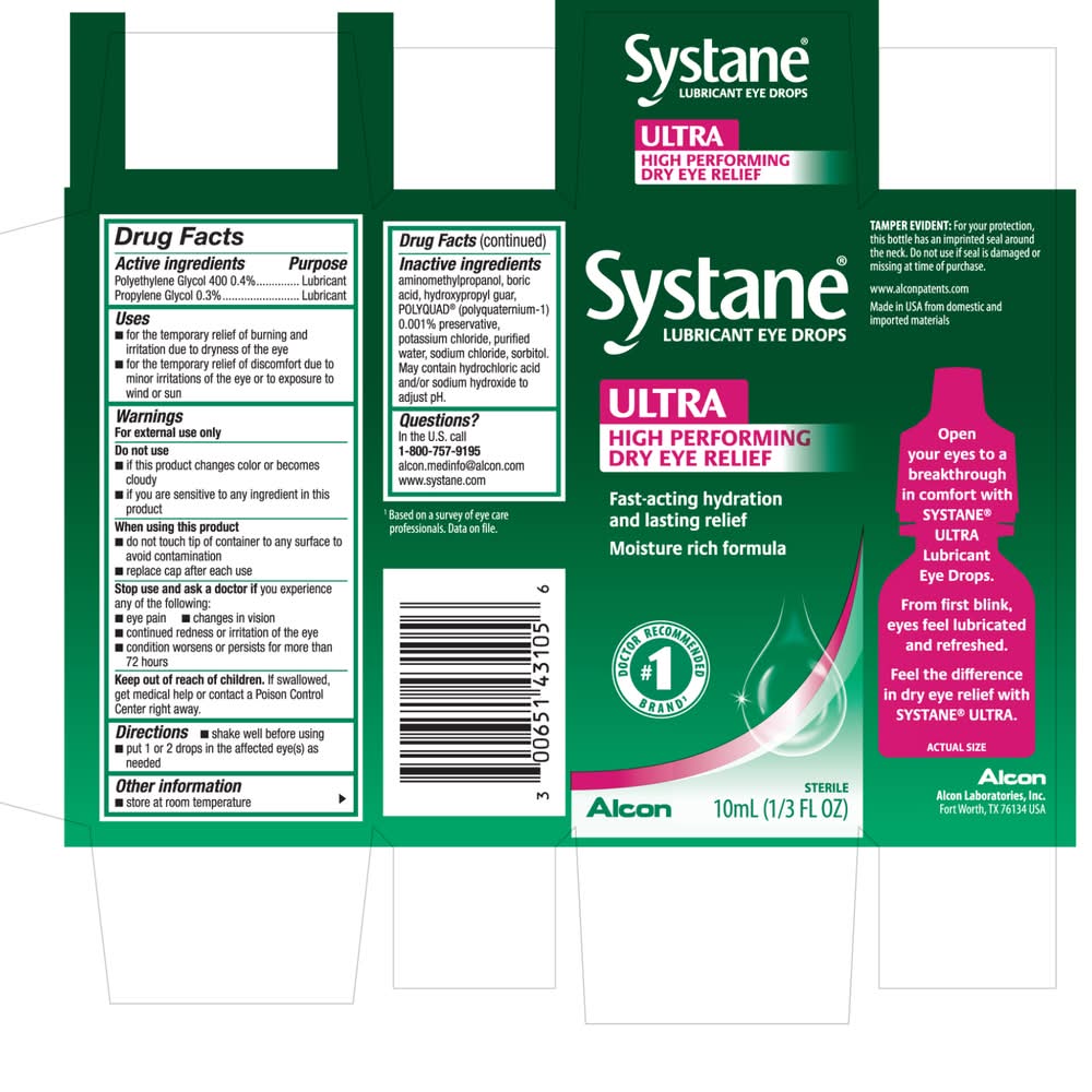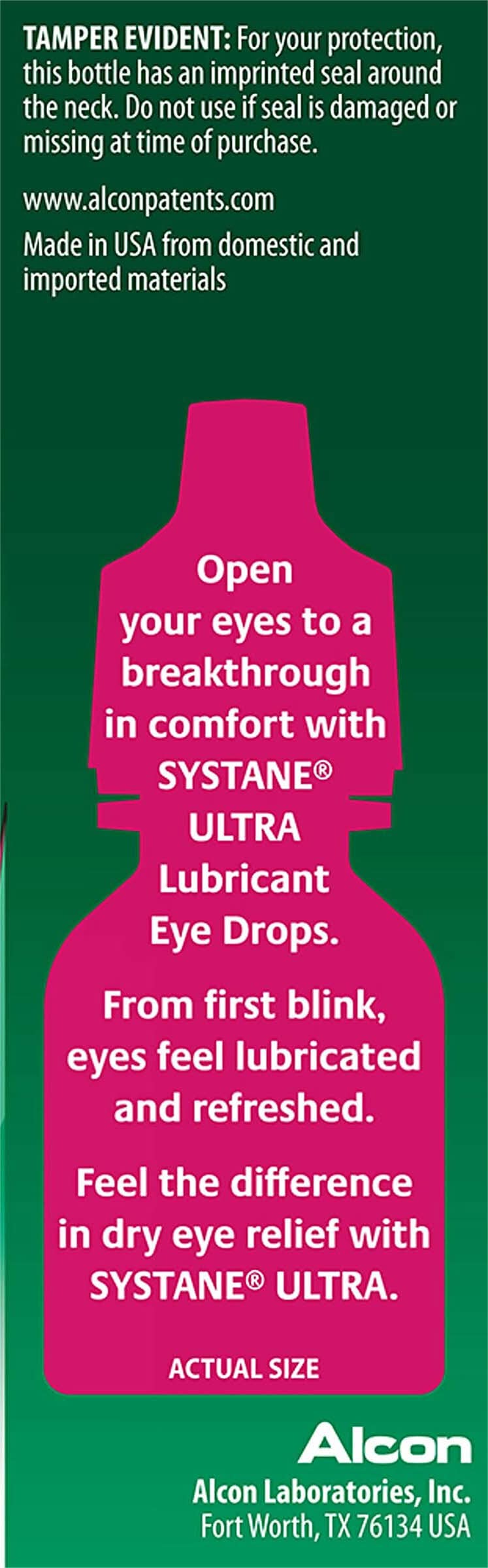 Systane Ultra Lubricant Eye drops provide high-performance relief from dry eye symptoms, ensuring lasting comfort and hydration. These advanced eye drops are specifically formulated to soothe and protect against irritation, burning, and discomfort caused by dry eyes. Systane Ultra offers a refreshing solution to keep your eyes feeling comfortable and moisturized throughout the day. Alcon Laboratories, Inc., Fort Worth, TX, 76134