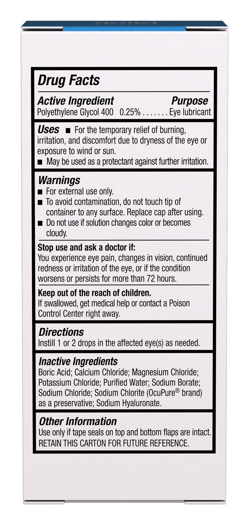 Ingredients: Polyethylene glycol 400 (0.25%), boric acid, calcium chloride, magnesium chloride, potassium chloride, purified water, sodium borate, sodium chloride, sodium chlorite (OcuPure brand) as a preservative, sodium hyaluronate. Additives: Inactive Ingredients: Boric Acid, Calcium Chloride, Magnesium Chloride, Potassium Chloride, Purified Water, Sodium Borate, Sodium Chloride, Sodium Chlorite (OcuPure Brand) as a Preservative, Sodium Hyaluronate.