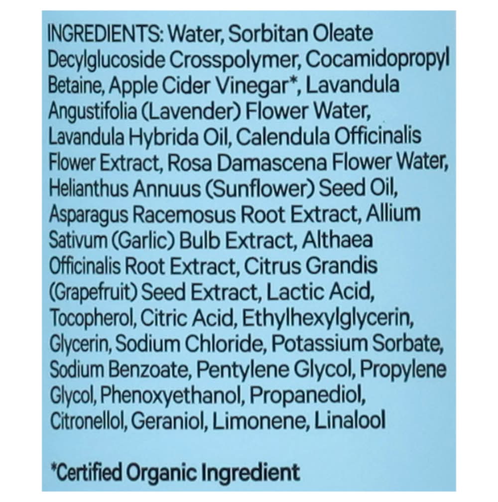 Ingredients: Water, Sorbitan Oleate Decylglucoside Crosspolymer, Cocamidopropyl Betaine, Apple Cider Vinegar*, Lavandula Angustifolia (Lavender) Flower Water, Lavandula Hybrida Oil, Calendula Officinalis Flower Extract, Rosa Damascena Flower Water, Helianthus Annuus (Sunflower) Seed Oil, Asparagus Racemosus Root Extract, Allium Sativum (Garlic) Bulb Extract, Althaea Officinalis Root Extract, Citrus Grandis (Grapefruit) Seed Extract, Lactic Acid, Tocopherol, Citric Acid, Ethylhexylglycerin, Glycerin, Sodium Chloride, Potassium Sorbate, Sodium Benzoate, Pentylene Glycol, Propylene Glycol, Phenoxyethanol, Propanediol, Citronellol, Geraniol, Limonene, Linalool. * Certified Organic Ingredient