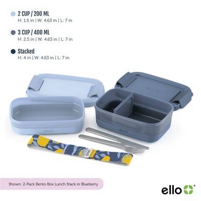PERFECT SIZE FOR YOUR WORK BAG. The Ello Stackable Bento Lunch Container is designed to keep food separate and is easy to fit in your work bag. This stack consists of a 2 cup container and a 3 cup container with a removable divider, along with a stainless steel fork and knife for convenience. Each container includes a locking lid so you can choose to use them together or separate. The machine-washable strap keeps the two containers together for easy transport, and the utensils fit snugly inside the strap. Set of 2 Box stainless steel fork and knife Color: Blue