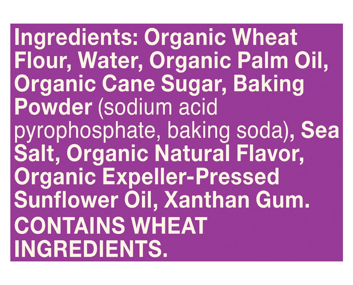 Ingredients: Organic Wheat Flour, Water, Organic Palm Oil, Organic Cane Sugar, Baking Powder (Sodium Acid Pyrophosphate, Baking Soda), Sea Salt, Organic Natural Flavor, Organic Expeller-Pressed Sunflower Oil, Xanthan Gum Contains: Wheat