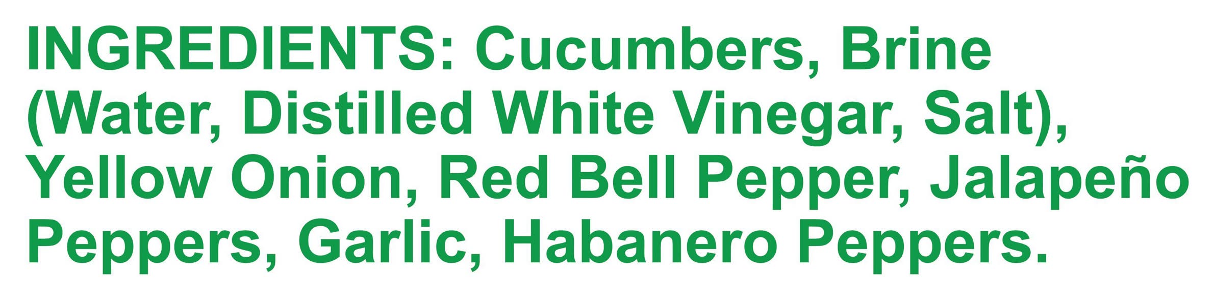 Ingredients: Cucumbers, Brine (Water, Distilled White Vinegar, Salt), Yellow Onion, Red Bell Pepper, Jalapeno Peppers, Garlic, Habanero Peppers Contains: 'Free From Gluten'