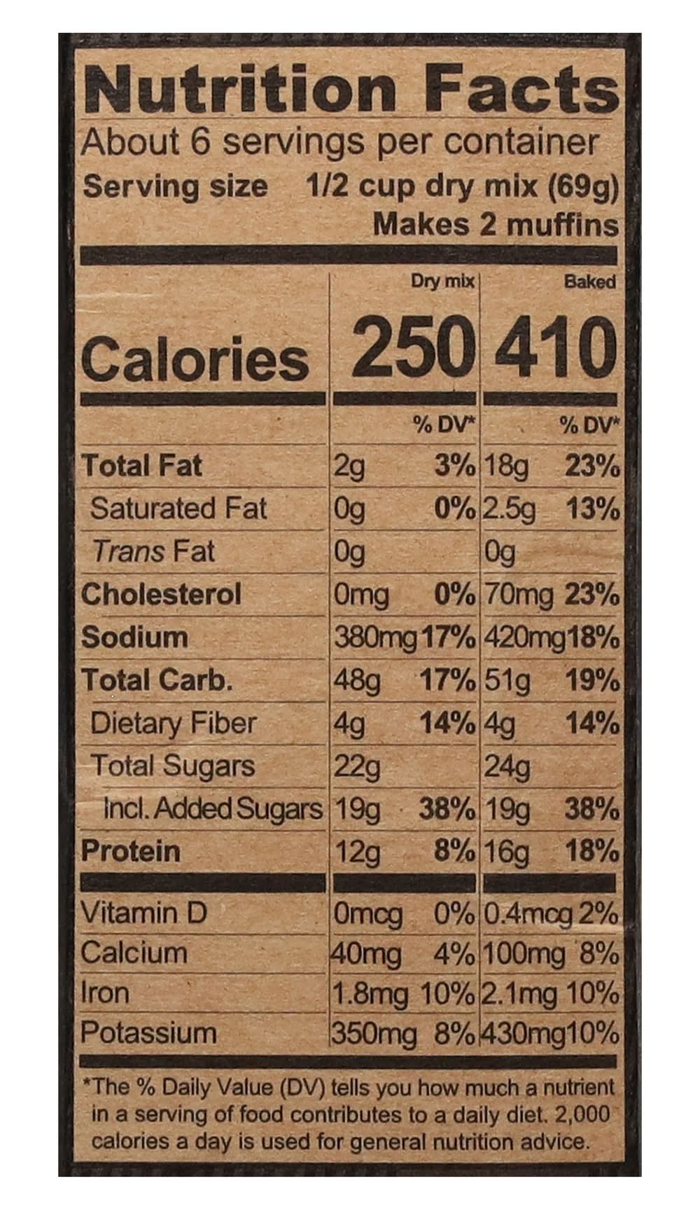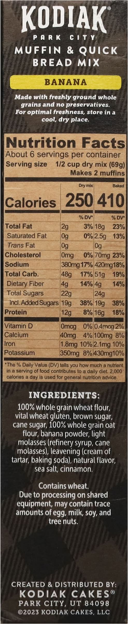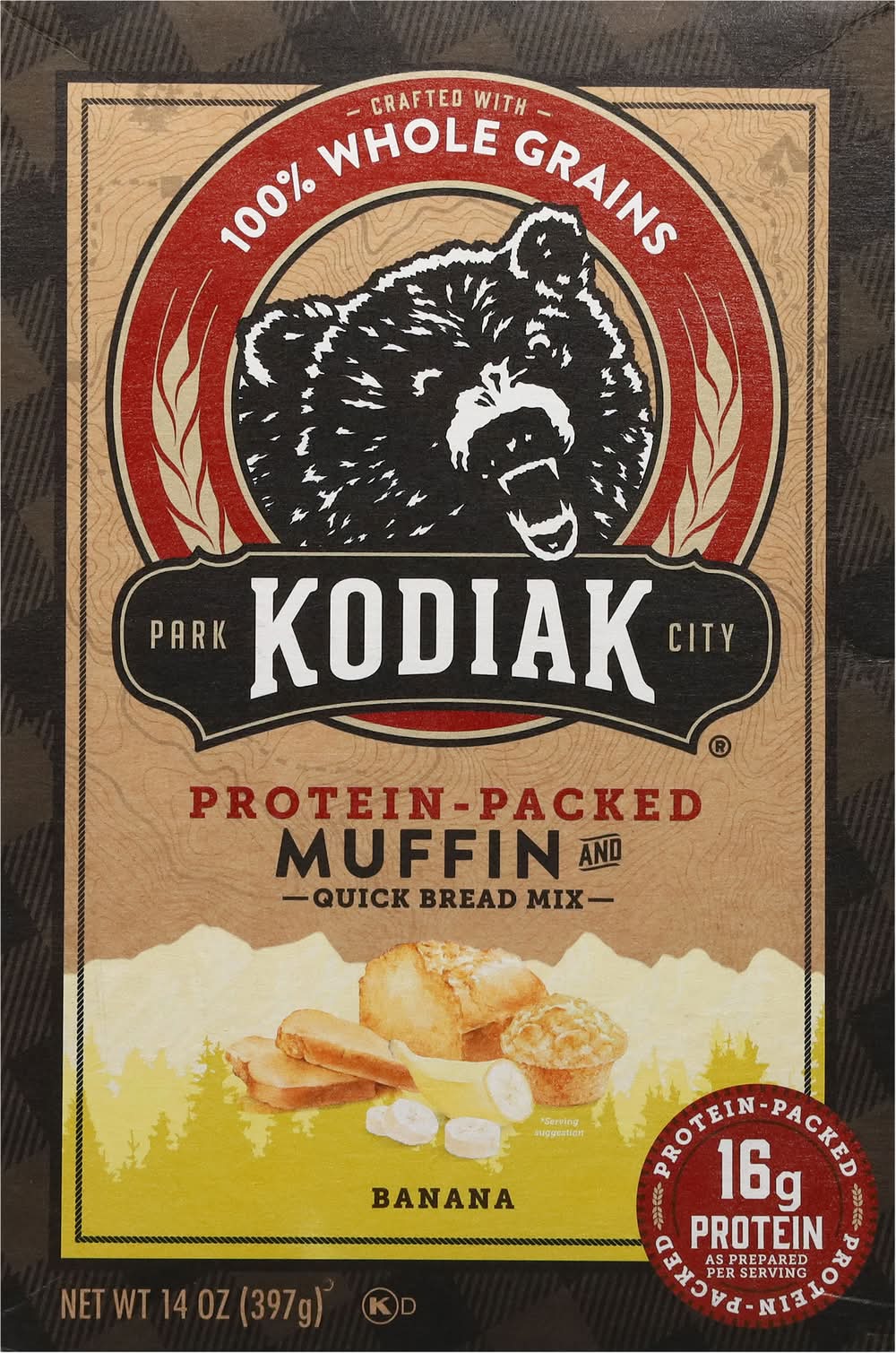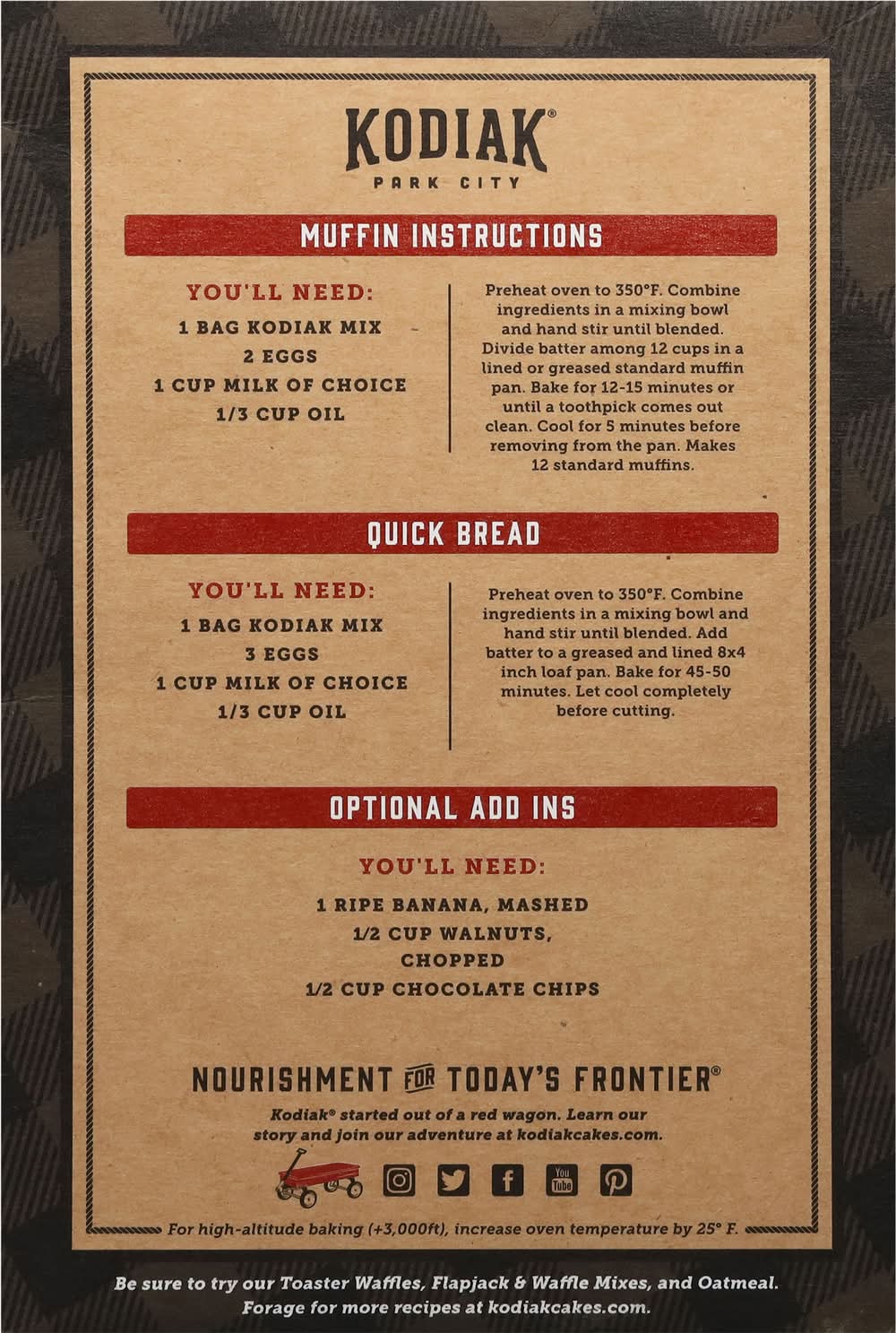 Muffin instructions: you'll need: 1 bag kodiak mix, 2 eggs, 1 cup milk of choice, 1/3 cup oil. preheat oven to 350 degrees f. combine ingredients in a mixing bowl and hand stir until blended. divide batter among 12 cups in a lined or greased standard muffin pan. bake for 12-15 minutes or until a toothpick comes out clean. cool for 5 minutes before removing from the pan. makes 12 standard muffins. quick bread: you'll need: 1 bag kodiak mix; 3 eggs; 1 cup milk of choice; 1/3 cup oil. preheat oven to 350 degrees f. combine ingredients in a mixing bowl and hand stir until blended. add batter to a greased and lined 8x4 inch loaf pan. bake for 45-50 minutes. let cool completely before cutting. optional add ins: you'll need: 1 ripe banana, mashed 1/2 cup walnuts, chopped 1/2 cup chocolate chips. for high-altitude baking (+3,000ft), increase oven temperature by 25 degrees f.