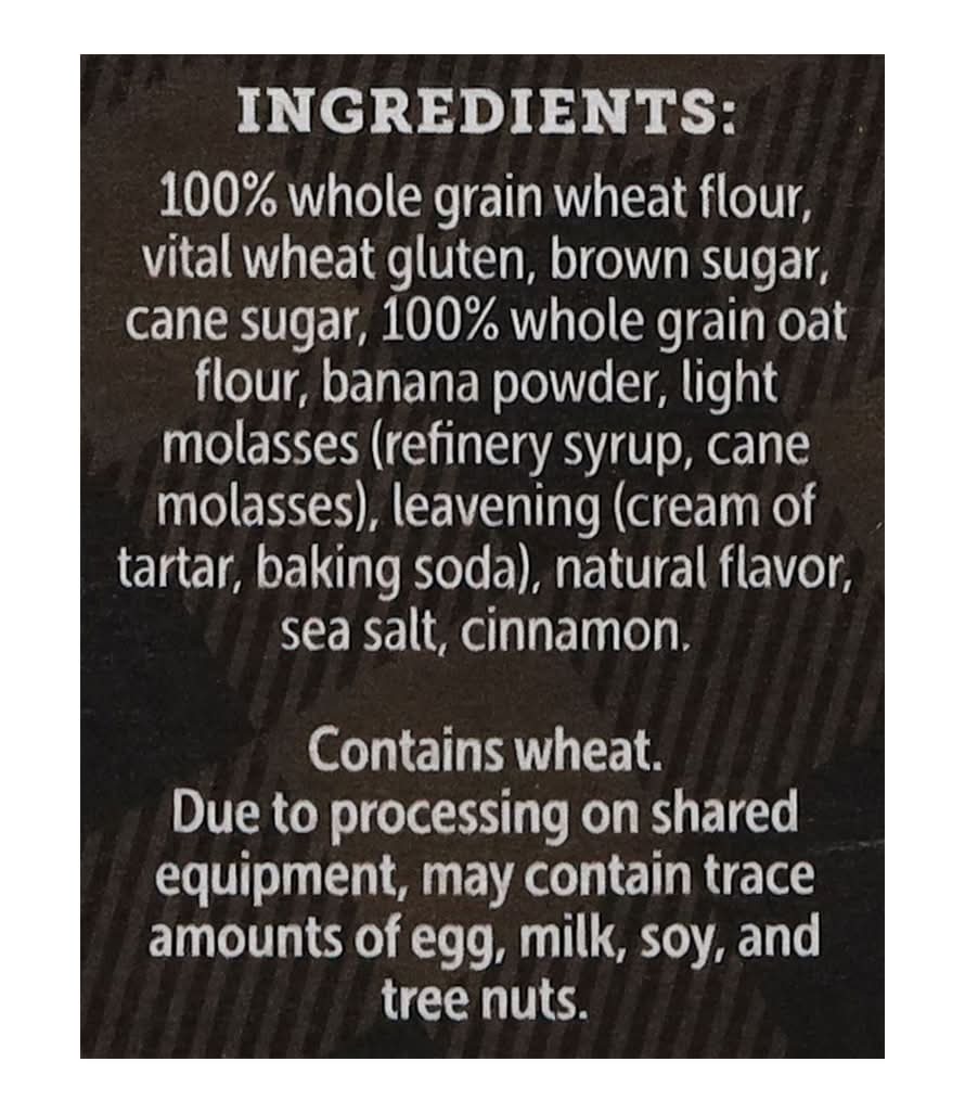 Ingredients: 100% Whole Grain Wheat Flour, Vital Wheat Gluten, Brown Sugar, Cane Sugar, 100% Whole Grain Oat Flour, Banana Powder, Light Molasses (Refinery Syrup, Cane Molasses), Leavening (Cream of Tartar, Baking Soda), Natural Flavor, Sea Salt, Cinnamon Contains: Wheat, Gluten, Oat, Eggs, Milk, Soybeans, Tree Nuts