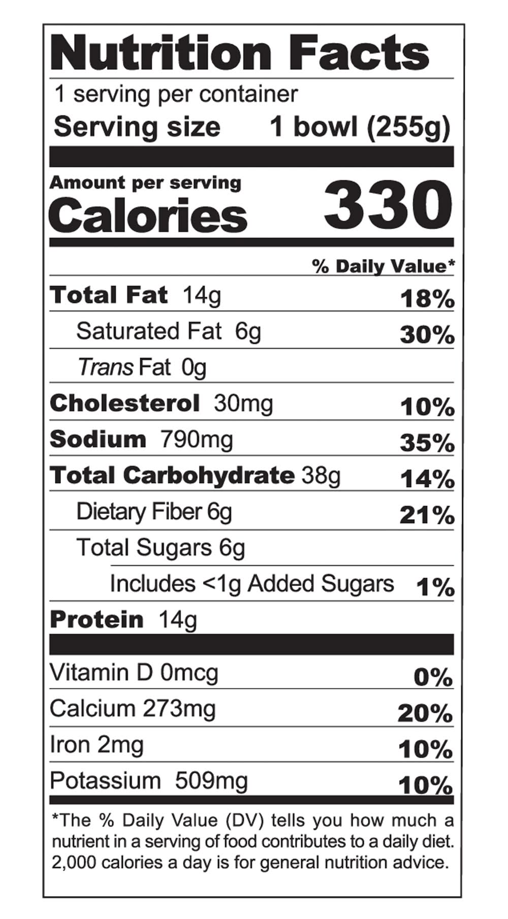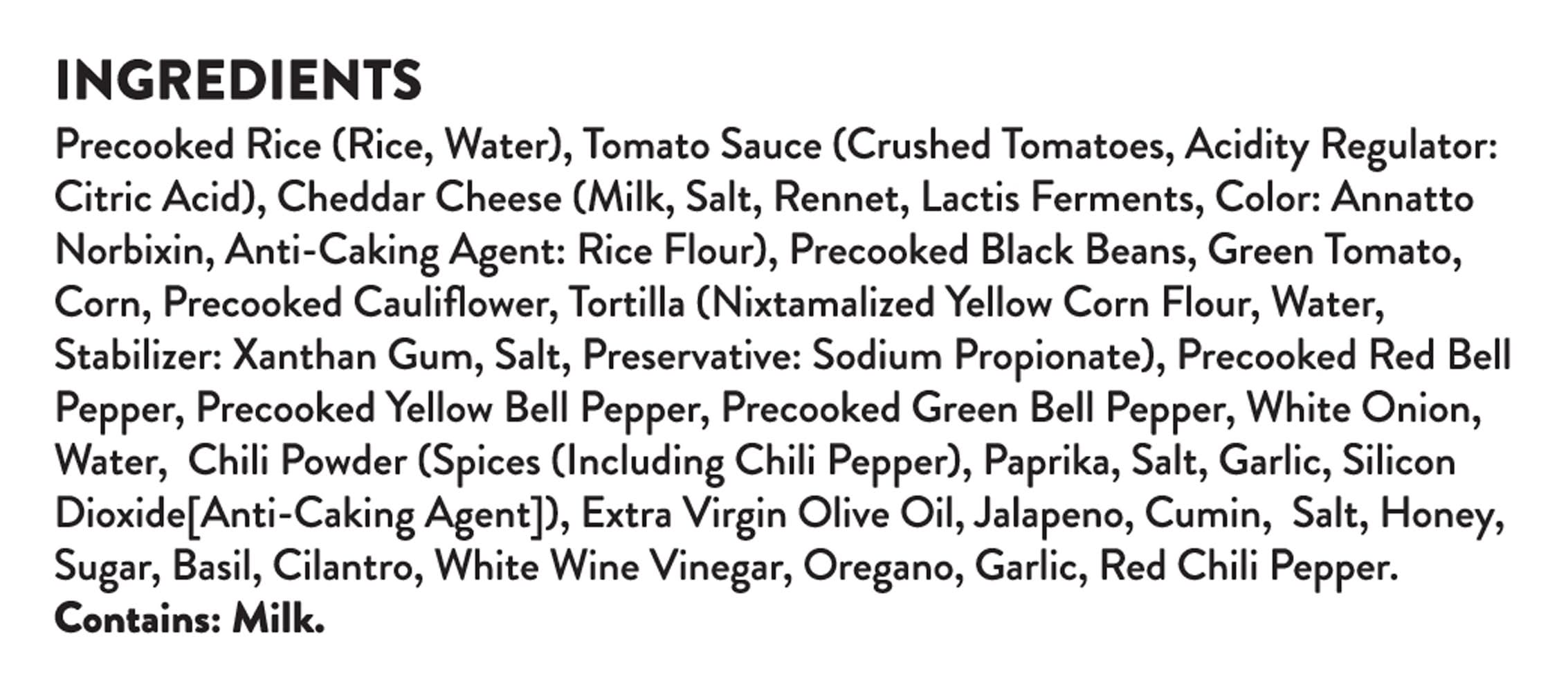 Ingredients: Precooked Rice (Rice, Water), Tomato Sauce (Crushed Tomatoes, Acidity Regulator: Citric Acid), Cheddar Cheese (Milk, Salt, Rennet, Lactis Ferments, Color: Annatto Norbixin, Anti-Caking Agent: Rice Flour), Precooked Black Beans, Green Tomato, Corn, Precooked Cauliflower, Tortilla (Nixtamalized Yellow Corn Flour, Water, Stabilizer: Xanthan Gum, Salt, Preservative: Sodium Propionate), Precooked Red Bell Pepper, Precooked Yellow Bell Pepper, Precooked Green Bell Pepper, White Onion, Water, Chili Powder (Spices (Including Chili Pepper), Paprika, Salt, Garlic, Silicon Dioxide [Anti-Caking Agent]), Extra Virgin Olive Oil, Jalapeno, Cumin, Salt, Honey, Sugar, Basil, Cilantro, White Wine Vinegar, Oregano, Garlic, Red Chili Pepper Contains: Milk
