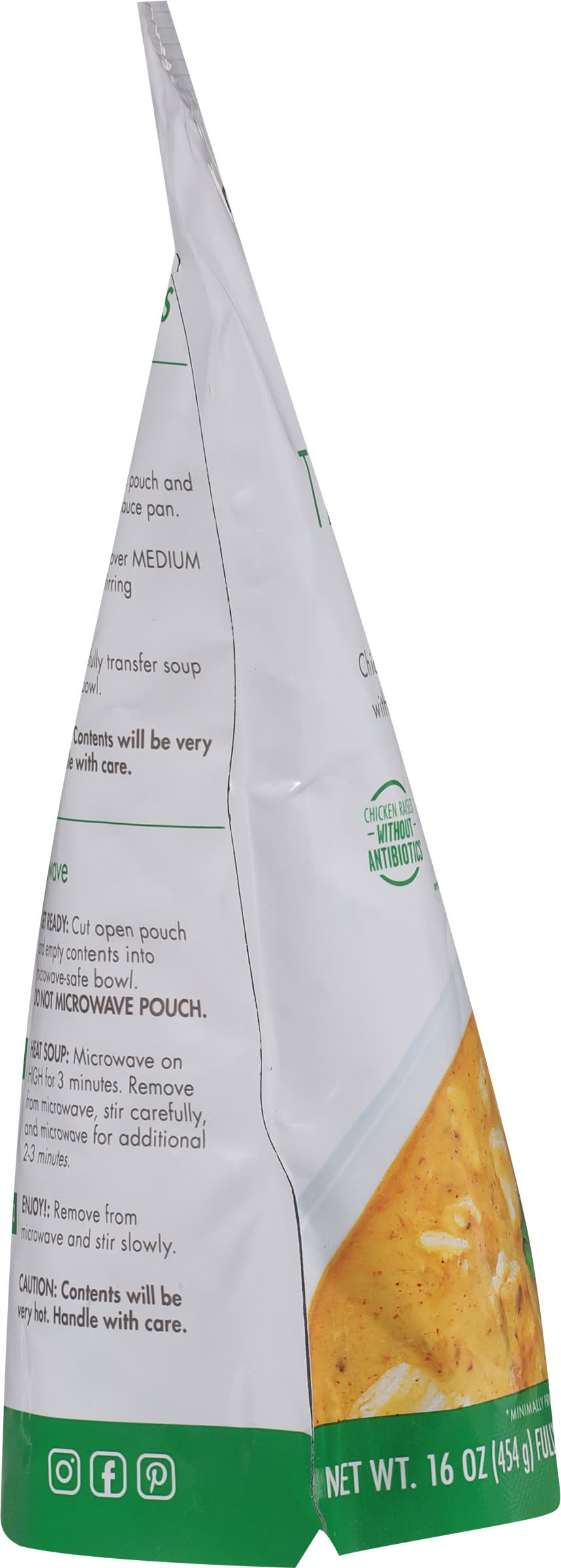 Directions for use: Heating Instructions: Stove Top: 1 Get Ready: Cut open pouch and empty contents into sauce pan. 2 Heat soup: Heat oven medium for 6-8 minutes, stirring frequently. 3 Enjoy!: Carefully transfer soup into serving bowl. Microwave: 1 Get Ready: Cut open pouch and empty contents into microwave-safe bow. 2 Heat Soup: Microwave on from microwave. Remove and microwave for additional 2-3 minutes. 3 Enjoy!: Remove from microwave and stir slowly. Caution: Contents will be very hot. Handle with care. Perishable. Keep refrigerated. Storage recommendation: Perishable. Keep refrigerated.