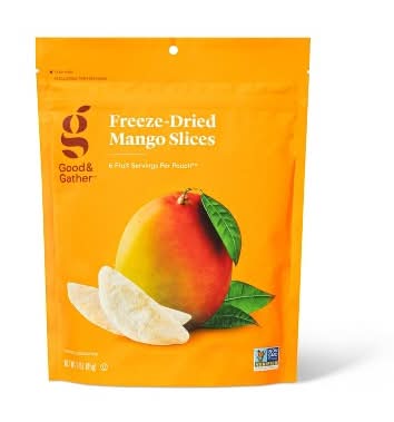 Discover a fresh new way to snack any time of the day with these Freeze-Dried Mango Slices from Good & Gather. These flavorful mango slices come in a resealable, stand-up pouch so you can keep the slices fresh between snacking, and each pouch contains six servings of fruit for plenty of nutritional value. Freeze-drying removes water from the fruit, while preserving the flavor and nutritional value. They are Kosher and Non-GMO Project verified. These sweet mango slices taste great added to trail mix, cereal or yogurt, or straight from the bag. Add them to your meal or salad or take them with on a busy day for an on-the-go snack. Every product that carries the Good & Gather name starts with quality ingredients that deliver great taste, making it easier for you and your family to eat well, every day. We promise you'll love each bite, or your money back.