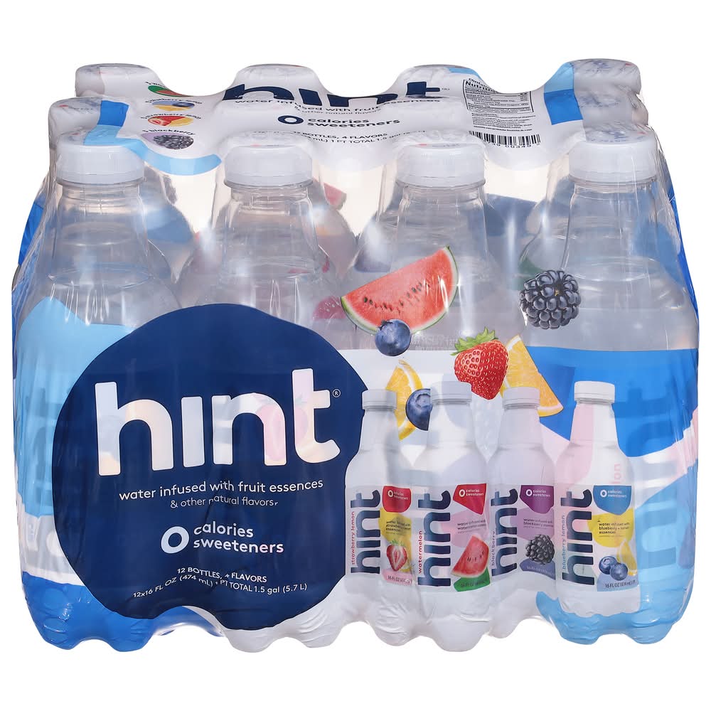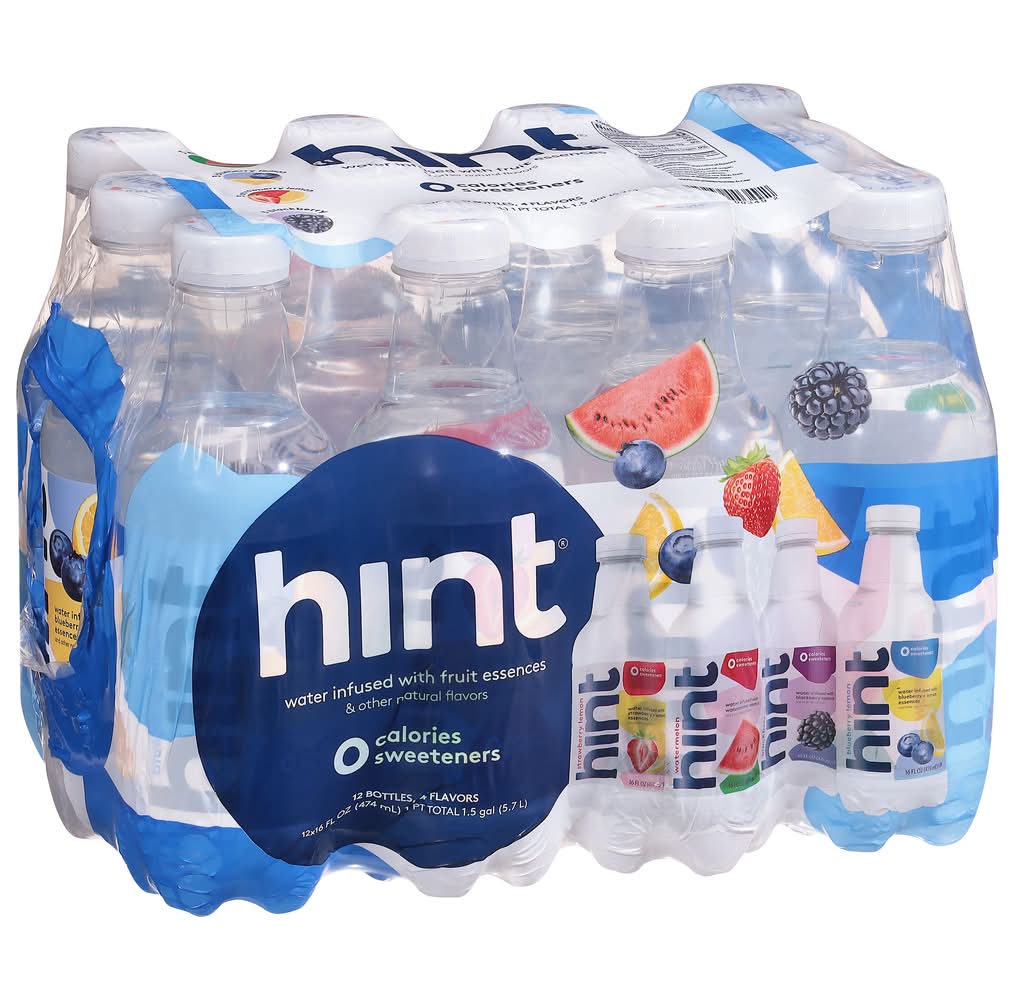 WATER WITH A TOUCH OF TRUE FRUIT FLAVOR: Our unique fruit essences create surprisingly accurate fruit flavors without adding sugar or diet sweeteners. The result? Delicious Hint Water that tastes like watermelon, blackberry, blueberry lemon, strawberry lemon and has zero calories. 4 OF OUR TOP FLAVORS: The hint Water Variety 12-Pack includes 3 bottles each of Watermelon, Blackberry, Blueberry Lemon, Strawberry Lemon. Hint is purified, unsweetened, fruit-infused water that has a fresh-picked flavor sure to satisfy your thirst. ZERO SUGAR, ZERO CALORIES: Hint contains no sugar and no calories giving Hint Water a deliciously clean taste that you can feel great about drinking. NO DIET SWEETENERS: Does not contain erythritol, sucralose, stevia, or aspartame HINT HELPS PEOPLE FALL IN LOVE WITH WATER: Most people know that they should be drinking more water and fewer sweetened beverages, but plain water is boring. Hint Water tastes so delicious that it actually helps people drink more water. BETTER HYDRATION, BETTER HEALTH: Staying hydrated can improve your mood, complexion, and muscle and joint health. Hint Water is also vegan, gluten-free, nut-free, NSF Non-GMO Certified, and kosher certified. Hint is the perfect way to hydrate deliciously. • Flavor: Strawberry lemon watermelon blackberry blueberry lemon • Pack size: 12 • Packaging: Reusable