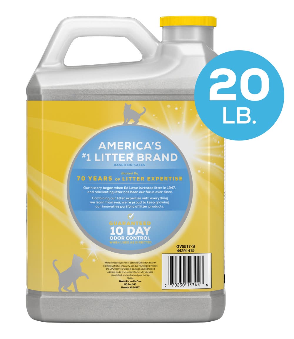 Multi-cat clumping litter with glade, low dust, and tight clumps, made with natural clay plus a deodorizing system, providing clumping power, absorption power. Tidy Cats, St. Louis, MO, 63164