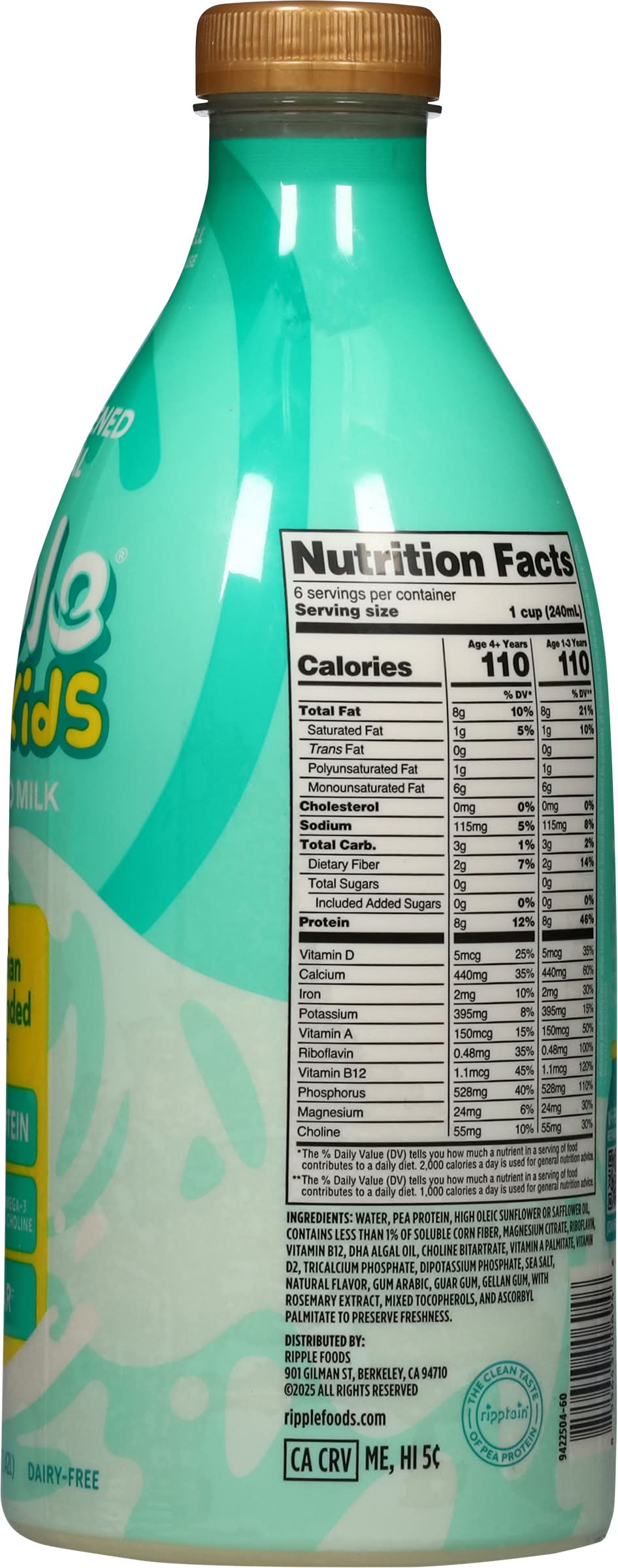 Can smart choices really be delicious? We say 'YES'! When you choose dairy free, you shouldn't have to compromise on nutrition or taste. Now we've made something especially for your little ones. Ripple ® Kids Unsweetened Original was developed to deliver key nutrients specifically for growing kids. In addition to the 8g of plant-based protein from peas, Ripple® Kids Unsweetened Original has 0g added sugar, 50mg DHA, choline, and prebiotic fiber for growing bodies, along with many of the essential nutrients found in dairy milk - calcium, magnesium, phosphorus, riboflavin, and vitamins A, D, and B12. And most important, it delivers the same creamy and delicious taste kids love! Packaging: Reusable