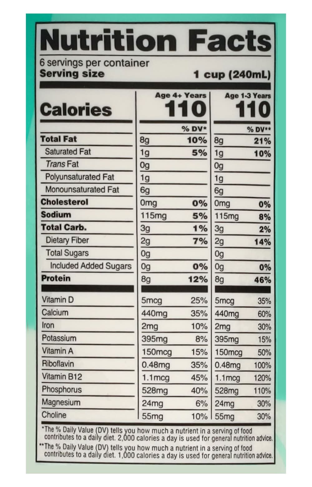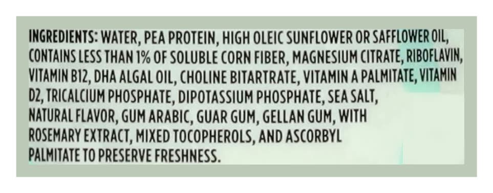 Ingredients: Water, Pea Protein, High Oleic Sunflower or Safflower Oil, Contains Less than 1% of Soluble Corn Fiber, Magnesium Citrate, Riboflavin, Vitamin B12, DHA Algal Oil, Choline Bitartrate, Vitamin A Palmitate, Vitamin D2, Tricalcium Phosphate, Dipotassium Phosphate, Sea Salt, Natural Flavor, Gum Arabic, Guar Gum, Gellan Gum, with Rosemary Extract, Mixed Tocopherols, and Ascorbyl Palmitate to Preserve Freshness Contains: Corn
