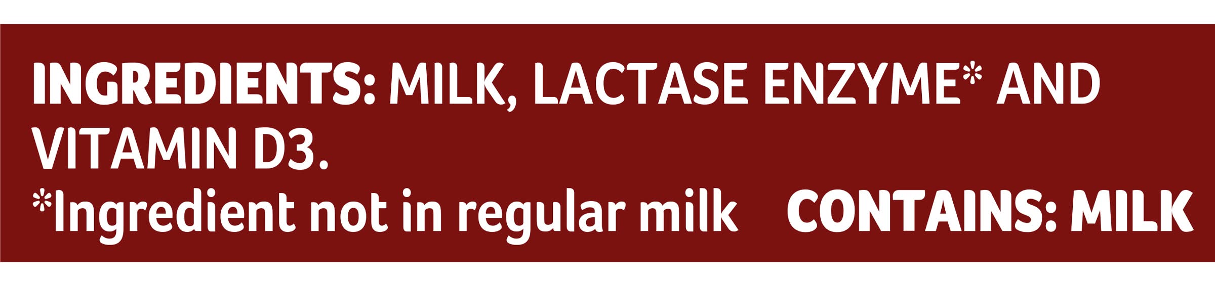 Ingredients: Milk, Lactase Enzyme (Ingredient Not in Regular Milk) and Vitamin D3. Contains: Contains: Milk.
