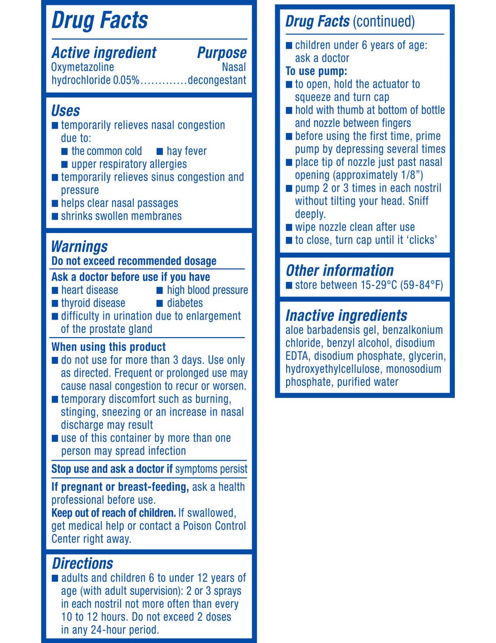 Directions: to open, hold the actuator to squeeze and turn cap. hold with thumb at bottom of bottle and nozzle between fingers. before using the first time, prime pump by depressing several times. place tip of nozzle just past nasal opening (approximately 1/8 inch). pump 2 or 3 times in each nostril without tilting your head. sniff deeply. wipe nozzle clean after use. to close, turn cap until it clicks. keep carton for complete warnings and information; see opposite panel for detailed instructions on how to use pump. to use pump: 1. to open, hold white wings with thumb and forefinger; with other hand, pinch gray grips on cap and twist to open. 2. hold with thumb at bottom of bottle and nozzle between your fingers. 3. before using the first time, prime pump by firmly depressing several times. 4. place tip of nozzle just past nasal opening (approximately 1/8 inch). 5. pump 2 or 3 times into each nostril without tilting your head. 6. sniff deeply. do not use more often than once every 10 to 12 hours. do not exceed 2 doses in any 24-hour period. wipe nozzle clean after use. 7. to close, hold white wings in place while turning the gray cap until it clicks. adults and children 6 to under 12 years of age (with adult supervision): 2 or 3 sprays in each nostril not more often than every 10 to 12 hours. do not exceed 2 doses in any 24-hour period. children under 6 years of age: ask a doctor.warnings: ask a doctor before use if you have: heart disease; high blood pressure; thyroid disease; diabetes; trouble urinating due to an enlarged prostate gland. when using this product: do not use more than directed; do not use for more than 3 days. use only as directed. frequent or prolonged use may cause nasal congestion to recur or worsen.; temporary discomfort such as burning, stinging, sneezing or an increase in nasal discharge may result; use of this container by more than one person may spread infection. stop use and ask a doctor if symptoms persist. if pregnant or breast-feeding, ask a health professional before use. keep out of reach of children. if swallowed, get medical help or contact a poison control center right away. safety sealed. do not use if marked tamper evident seal around the bottle is broken or missing.