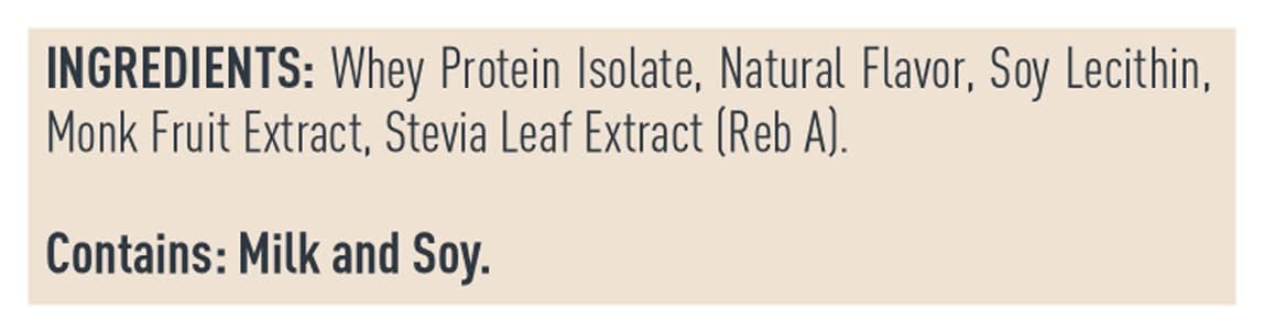 Ingredients: Whey Protein Isolate, Natural Flavor, Soy Lecithin, Monk Fruit Extract, Stevia Leaf Extract (Reb A) Contains: Milk, Soybeans