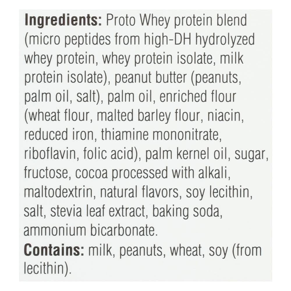 Ingredients: Proto Whey Protein Blend (Micro Peptides from High-Dh Hydrolyzed Whey Protein, Whey Protein Isolate, Milk Protein Isolate), Peanut Butter (Peanuts, Palm Oil, Salt), Palm Oil, Enriched Flour (Wheat Flour, Malted Barley Flour, Niacin, Reduced Iron, Thiamine Mononitrate, Riboflavin, Folic Acid), Palm Kernel Oil, Sugar, Fructose, Cocoa Processed with Alkali, Maltodextrin, Natural Flavors, Soy Lecithin, Salt, Stevia Leaf Extract, Baking Soda, Ammonium Bicarbonate Contains: Milk, Peanuts, Wheat, Soybeans, Barley