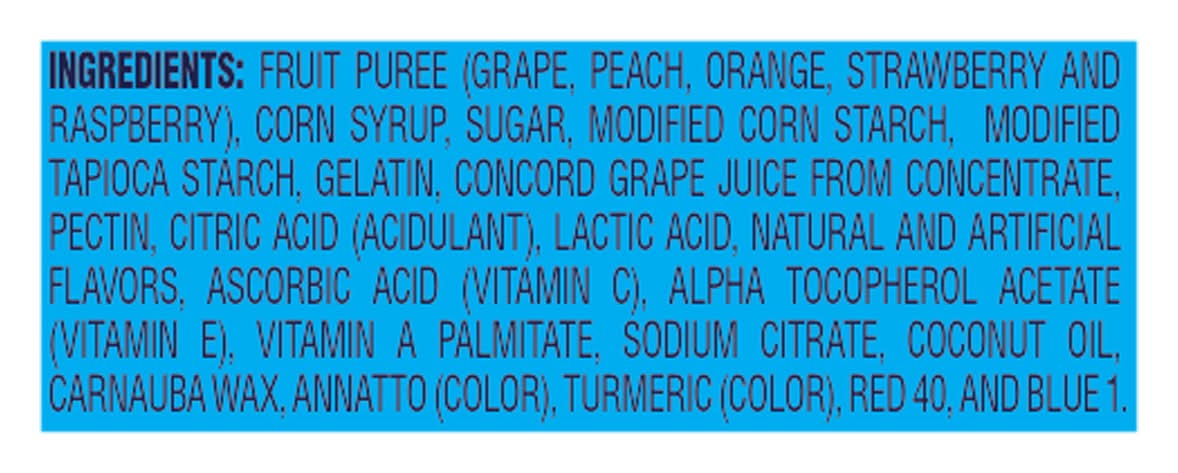 Ingredients: Fruit Puree (Grape, Peach, Orange, Strawberry and Raspberry), Corn Syrup, Sugar, Modified Corn Starch, Modified Tapioca Starch, Gelatin, Concord Grape Juice from Concentrate, Pectin, Citric Acid (Acidulant), Lactic Acid, Natural and Artificial Flavors, Ascorbic Acid (Vitamin C), Alpha Tocopherol Acetate (Vitamin E), Vitamin A Palmitate, Sodium Citrate, Coconut Oil, Carnauba Wax, Annatto (Color), Turmeric (Color), Red 40, and Blue 1 Contains: Corn, Tree Nuts, Coconuts