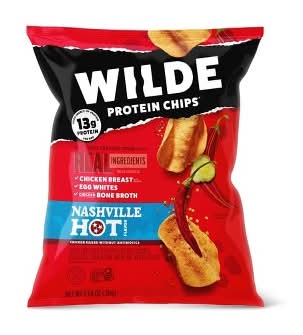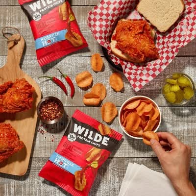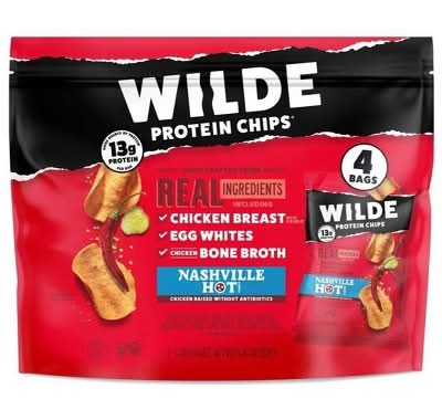 Each bag of Wilde Chips is crafted from real ingredients including 100% all-natural chicken breast, egg whites and bone broth. High in protein and low in carbs, now you can enjoy the perfect blend of aged Tabasco red peppers and parika in our Nashville Hot protein chips. • Flavor: Nashville hot • Pack size: 4