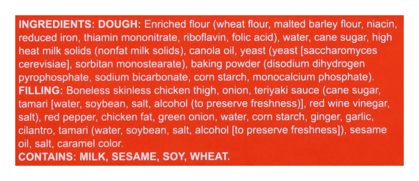 Ingredients: Dough: Enriched Flour (Wheat Flour, Malted Barley Flour, Niacin, Reduced Iron, Thiamin Mononitrate, Riboflavin, Folic Acid), Water, Cane Sugar, High Heat Milk Solids (Nonfat Milk Solids), Canola Oil, Yeast (Yeast [Saccharomyces Cerevisiae], Sorbitan Monostearate), Baking Powder (Disodium Dihydrogen Pyrophosphate, Sodium Bicarbonate, Corn Starch, Monocalcium Phosphate). Filling: Boneless Skinless Chicken Thigh, Onion, Teriyaki Sauce (Cane Sugar, Tamari [Water, Soybean, Salt, Alcohol (to Preserve Freshness)], Red Wine Vinegar, Salt), Red Pepper, Chicken Fat, Green Onion, Water, Corn Starch, Ginger, Garlic, Cilantro, Tamari (Water, Soybean, Salt, Alcohol [to Preserve Freshness]), Sesame Oil, Salt, Caramel Color Contains: Milk, Sesame, Soybeans, Wheat, Corn, Barley