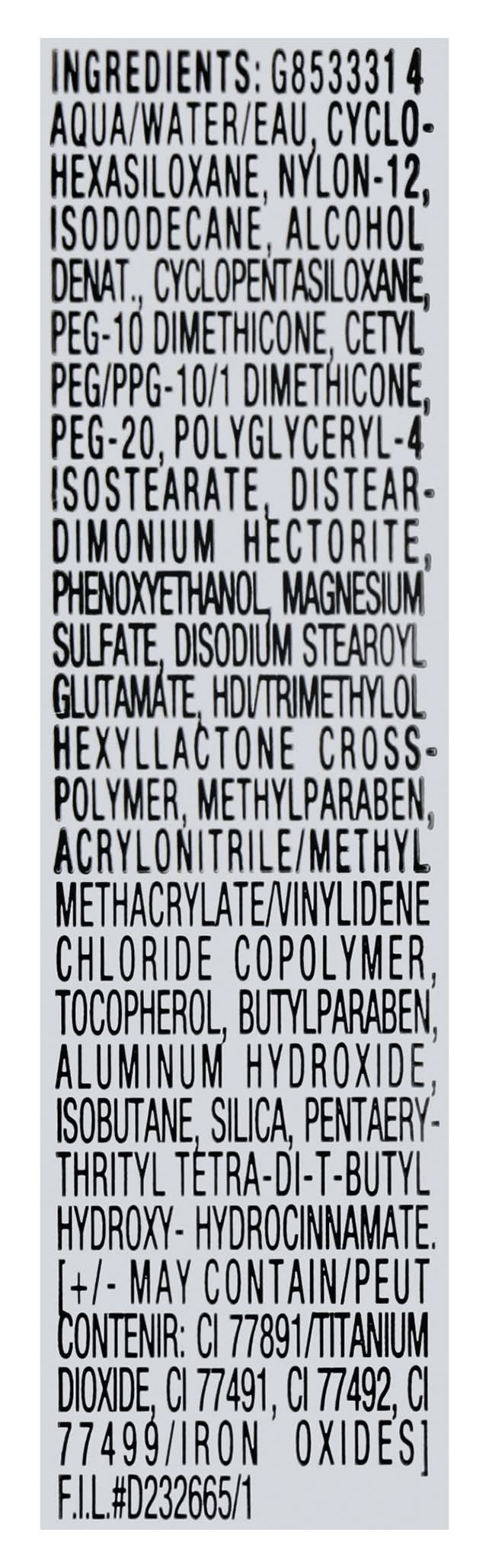Ingredients: G8533314: Aqua/Water/Eau, Cyclohexasiloxane, Nylon-12, Isododecane, Alcohol Denat, Cyclopentasiloxane, PEG-10 Dimethicone, Cetyl PEG PPG-10/1 Dimethicone, PEG-20, Polyglyceryl-4 Isostearate, Disteardimonium Hectorite, Phendkiethanol, Magnesium Sulfate, Disodium Stearoyl Glutamate, HDI/Trimethylol Hexyllactone Crosspolymer, Methylparaben, Acrylonitrile/Methyl Methacrylate/Vinylidene Chloride Copolymer, Tocopherol, Butylparaben, Aluminum Hydroxide, Isobutane, Silica, Pentaerythrityl Tetra-Di-T-Butyl Hydroxy- Hydrocinnamate, [+/- May Contain: CI 77891/Titanium Dioxide, CI 77491, CI 77492, CI 77499/Iron Oxides]