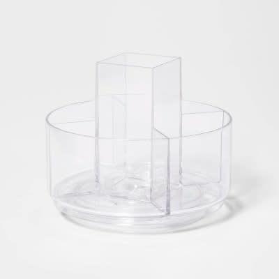 Help keep your everyday beauty essentials neatly organized and within easy reach with the space-saving storage of this handy Make-Up Turntable Beauty Organizer from Brightroom™. Featuring multiple compartments in a clear and compact design, this rotating beauty organizer makes it easy to stash your brushes, cosmetics, moisturizers and more in a single spot while keeping your countertops or cabinets clutter free. The clear plastic construction makes it easy to view the organizer's contents so you can always see what you need. Brightroom™ started with a simple truth: When you’ve got it together, you feel better. Our versatile designs reveal the possibility in every closet, cupboard and drawer, and work together to create brilliant ways to organize your every day. Size: Small