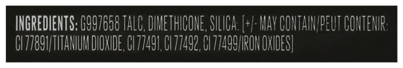 Ingredients: Talc, Dimethicone, Silica, [+/- May Contain: CI 77891/Titanium Dioxide, CI 77491, CI 77492, CI 77499/Iron Oxides]. FIL D199065/1