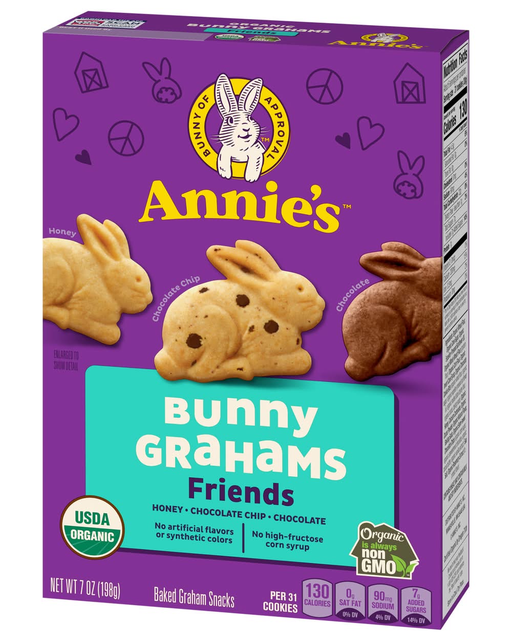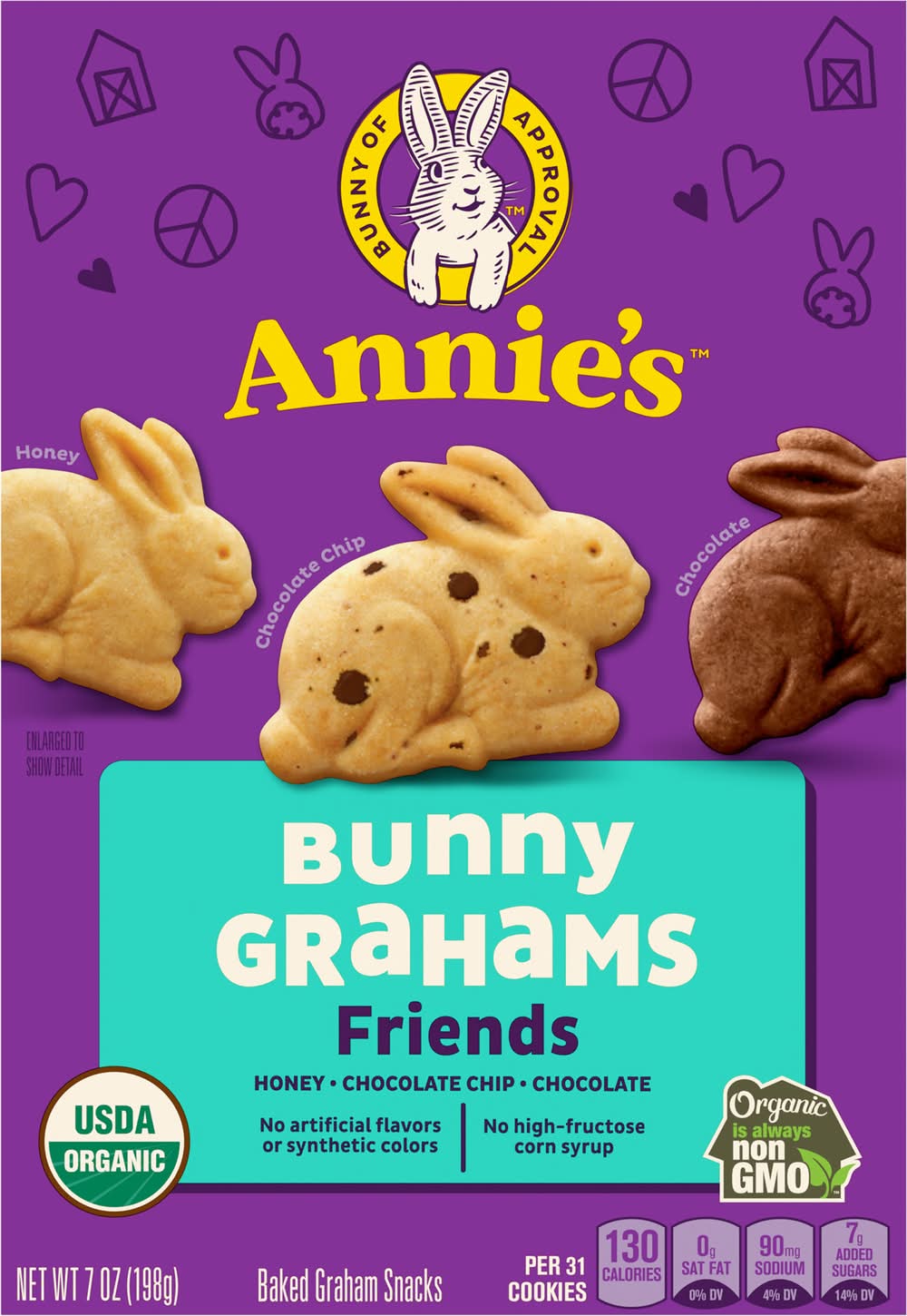 Kids will love the crunchy, munchy taste of Annie's Friends Organic Bunny Graham snacks. Enjoy the fun variety of three different flavors: chocolate chip, chocolate, and honey. These bunny-shaped baked graham cracker snacks for kids are great for sharing and spreading smiles among their friends. Certified USDA Organic and non-GMO, hop along to try a box of these Annie's Bunny Grahams that will make everybunny smile. Sprinkle lots of joy and hoppiness into your family's day with these organic snacks made without high fructose corn syrup, artificial flavors, or synthetic colors. Annie's makes products in over 20 family-friendly categories, from fruit flavored snacks and cereal to mac and cheese. For busy bunnies and families on the go, we help make life a little easier and more delicious by spreading goodness through tasty foods and kindness to the planet. Flavor: Honey-chocolate chip-chocolate