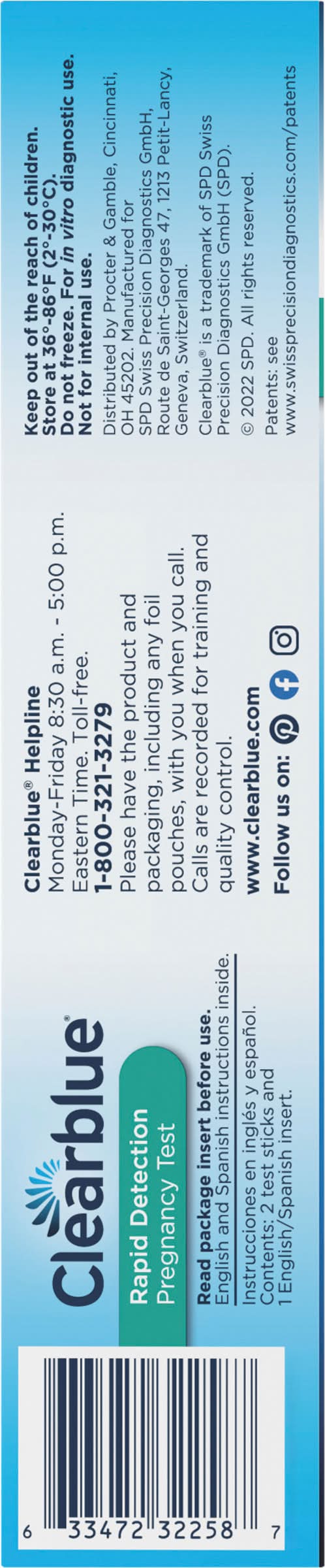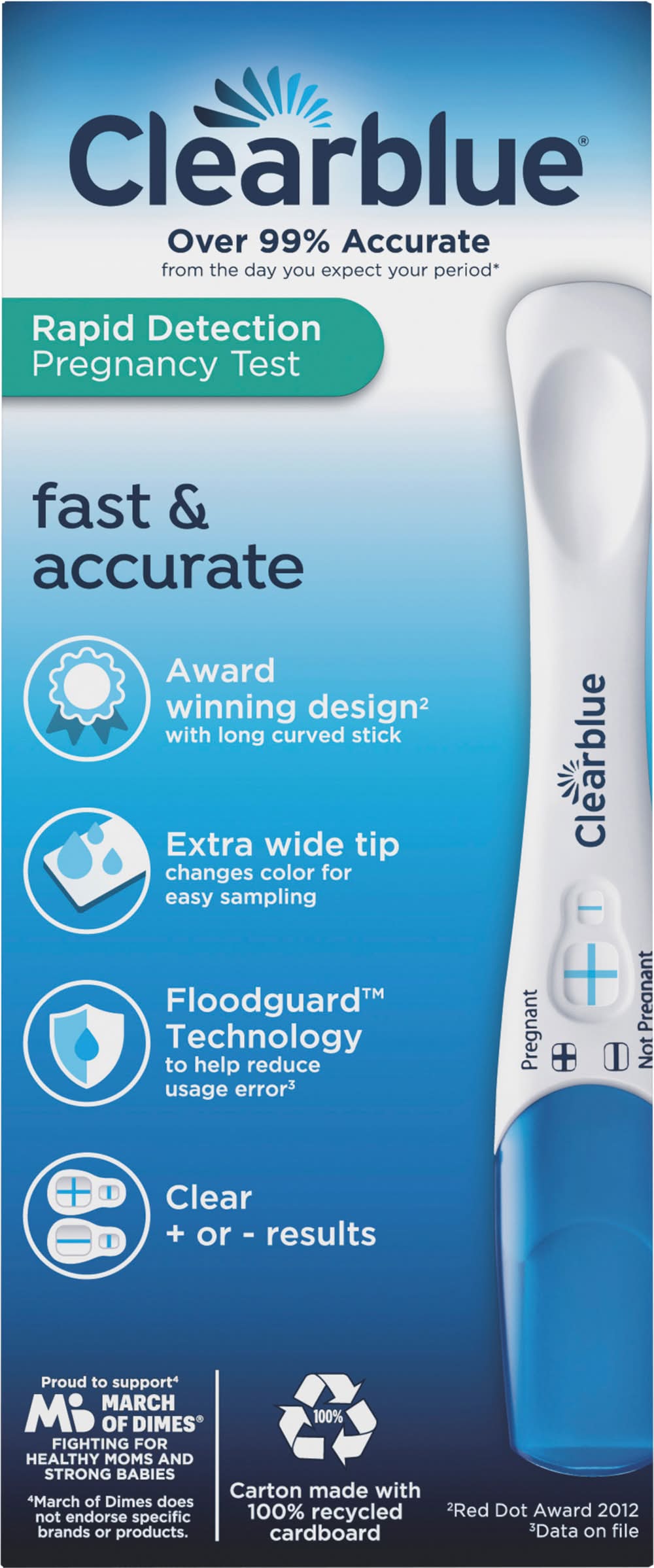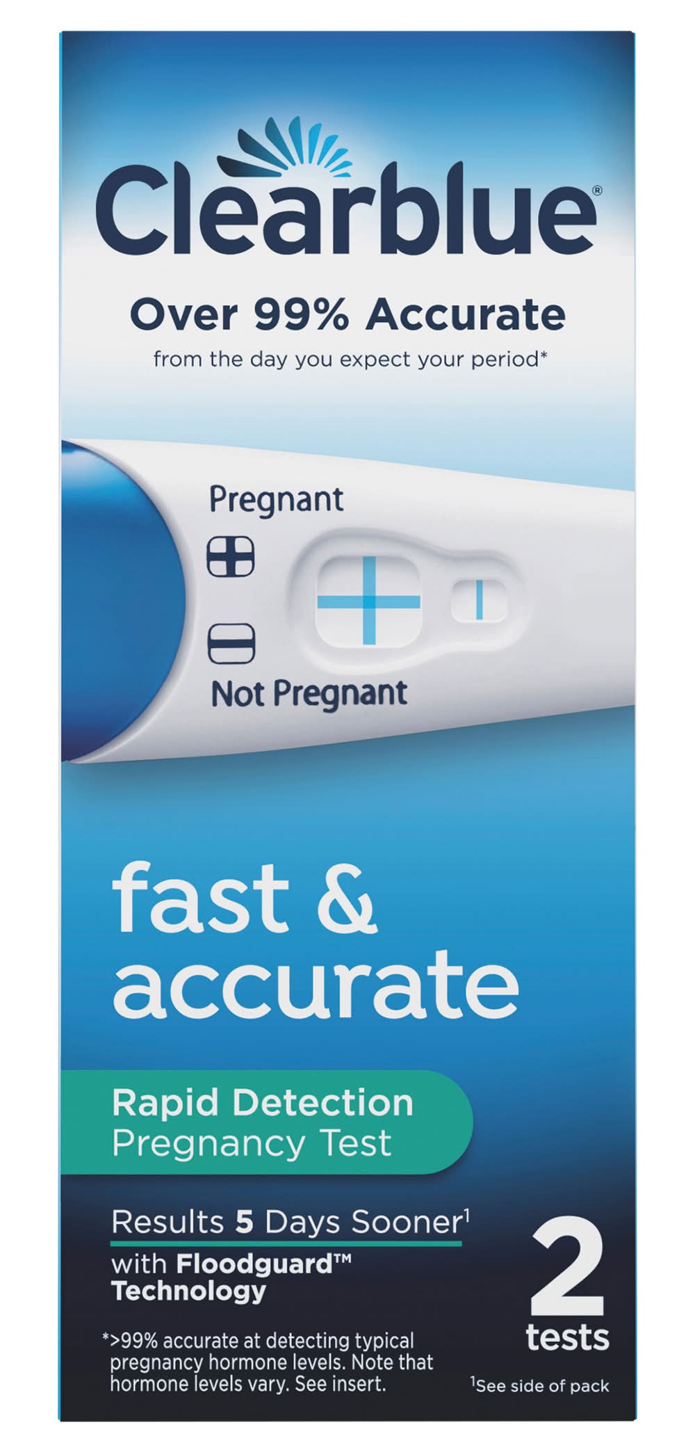 Contents: 2 test sticks and 1 English/Spanish insert. Over 99% accurate from the day of your expected period (99% accurate at detecting typical pregnancy hormones levels. Note that hormone levels may vary. See insert). Fast & accurate. Over 99% accurate from the day you expect your period (99% accurate at detecting typical pregnancy hormone levels. Packaging: Reusable