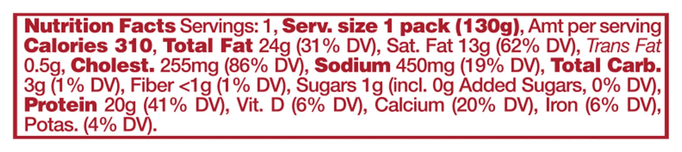 Cage free (Eggs from hens never confined to a cage) eggs with uncured bacon, Monterey jack and cheddar cheeses. Per Serving: 20 g protein; 1 g total sugars. Certified Gluten-free by GFCO. Simple. Honest. Better. Cooks in 60 seconds. U.S. inspected and passed by Department of Agriculture. Made in the USA. Flavor: Bacon & cheese