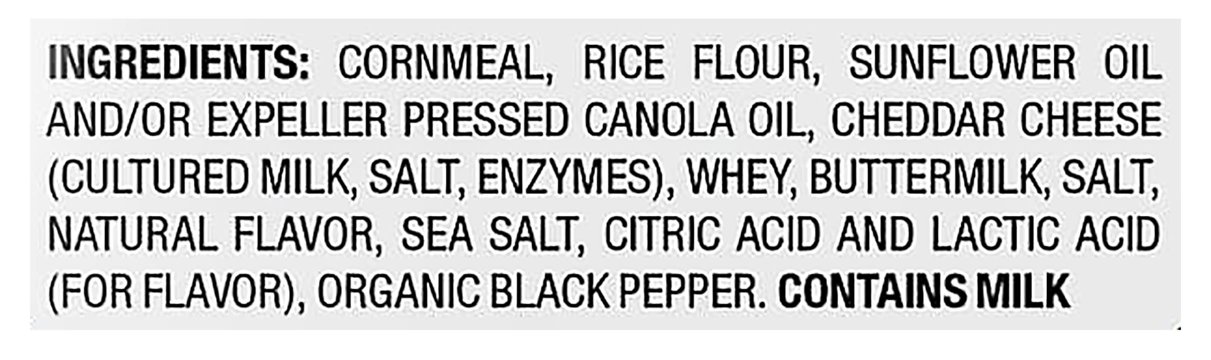 Ingredients: Cornmeal, Rice Flour, Sunflower Oil and/or Expeller Pressed Canola Oil, Cheddar Cheese (Cultured Milk Salt Enzymes), Whey, Buttermilk, Salt, Natural Flavor, Sea Salt, Lactic Acid, Citric Acid, Organic Black Pepper Contains: Milk