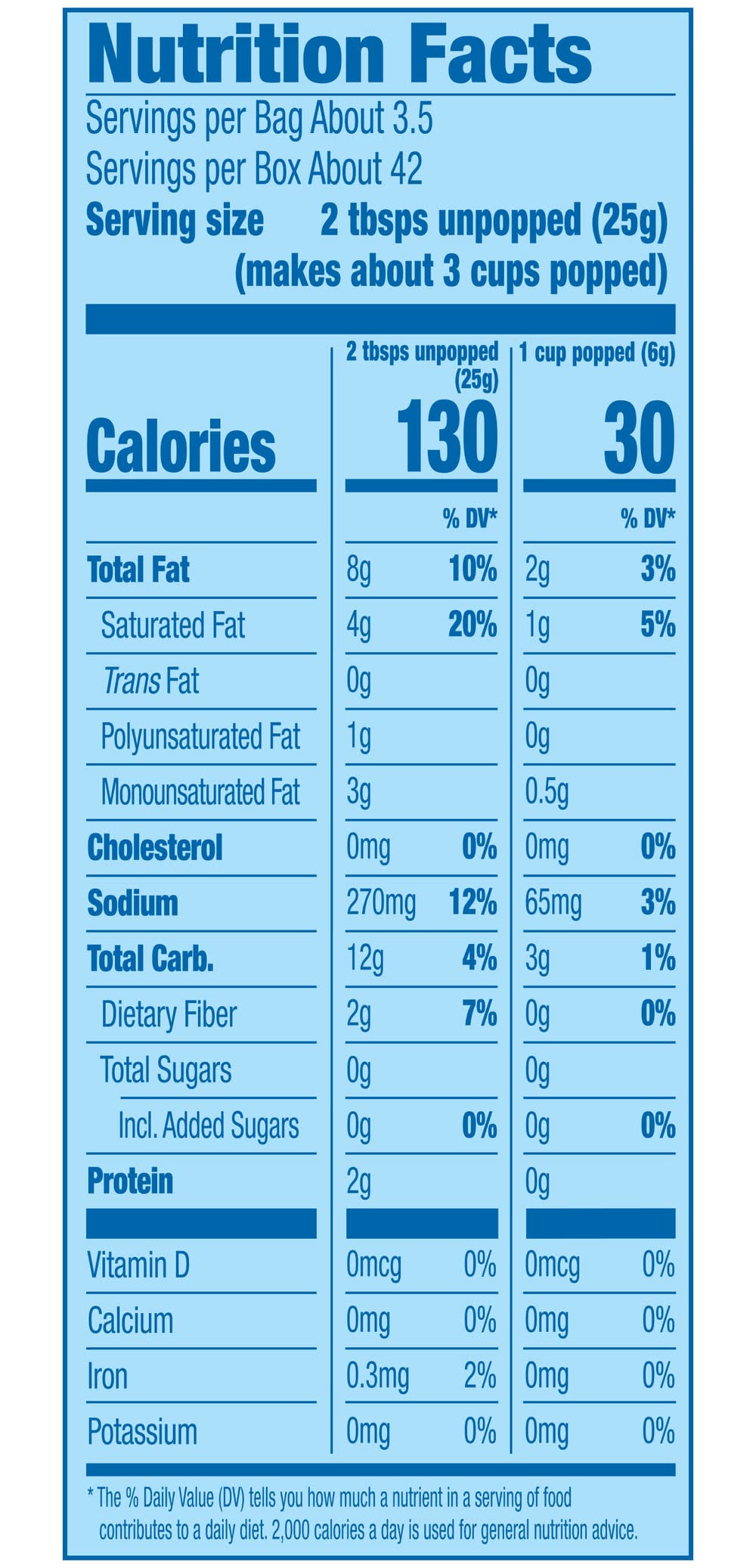 Ingredients: INGREDIENTS: POPCORN, PALM OIL, SALT, NATURAL FLAVOR (MILK), ROSEMARY EXTRACT (FOR FRESHNESS), ANNATTO EXTRACT (COLOR), PAPRIKA EXTRACT (COLOR), LACTIC ACID. CONTAINS: MILK Contains: CONTAINS: Milk/Dairy