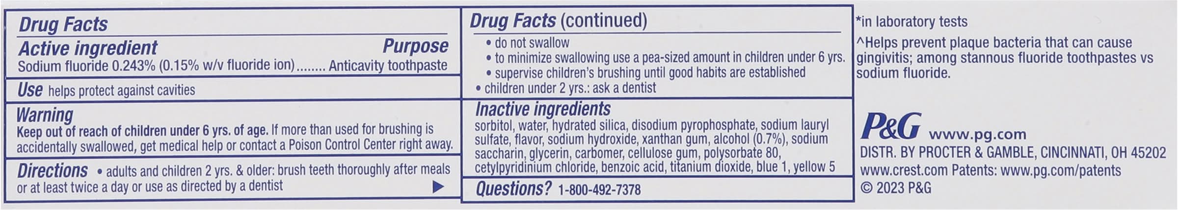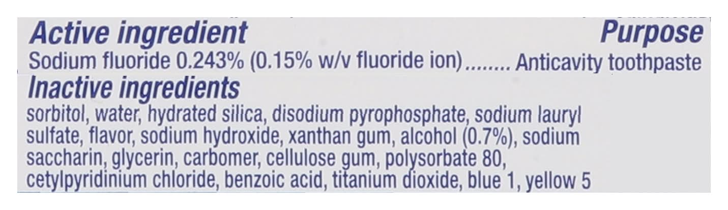 Ingredients: Active Ingredients: Sodium Fluoride (0.15% w/v Flouride Ion) (0.243 %), Anticavity Toothpaste. Inactive Ingredients: Sorbitol, Water, Hydrated Silica, Disodium Pyrophosphate, Sodium Lauryl Sulfate, Flavor, Sodium Hydroxide, Xanthan Gum, Alcohol (0.7%), Sodium Saccharin, Glycerin, Carbomer, Cellulose Gum, Polysorbate 80, Cetylpyridinium Chloride, Benzoic Acid, Titanium Dioxide, Blue 1, Yellow 5