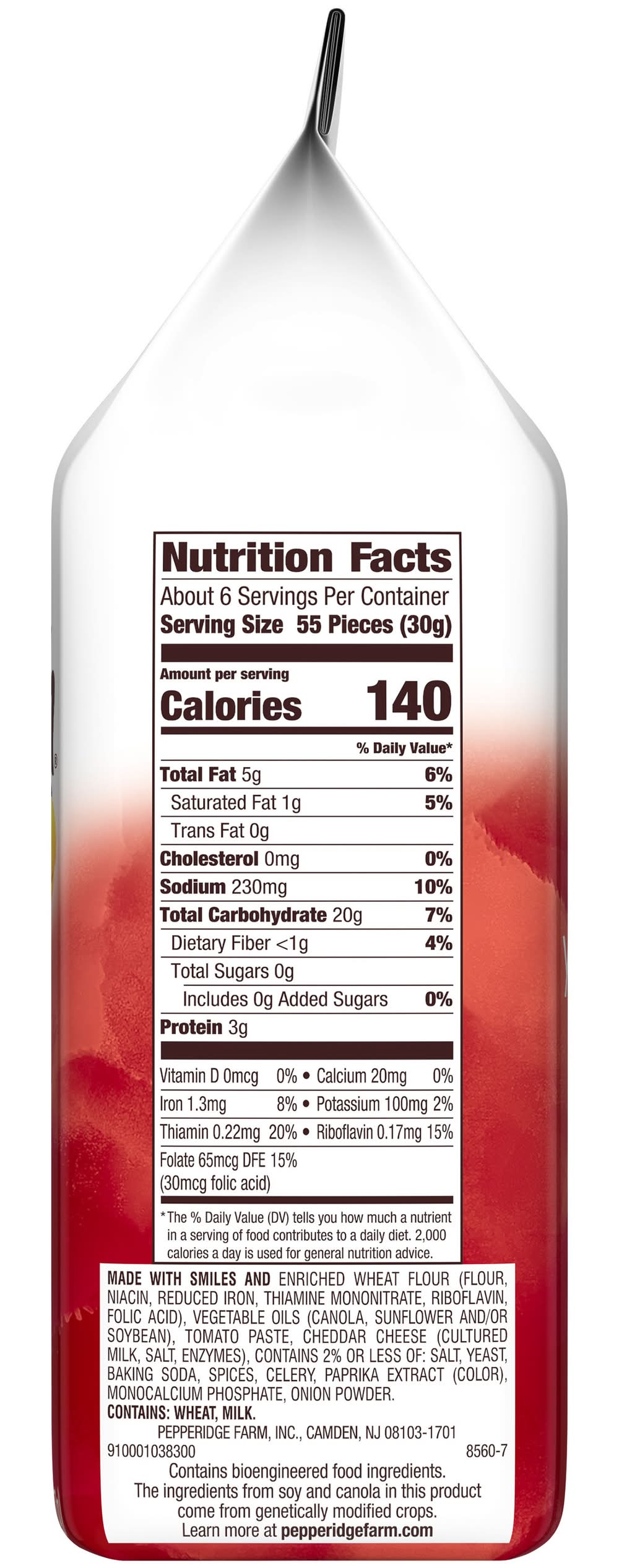 Get ready to savor Pizza Crackers, a snack that's as fun as it is flavorful! These snacks are the perfect blend of tasty and crunchy, baked to perfection to bring you that classic pizza flavor you love. These pizza flavored crackers are always baked with 100% real cheddar cheese, just like the Cheddar Crackers. They have a zesty, cheesy taste with a pizza flavor twist and a crispy texture that makes each handful a delightful snacking experience. Whether you're watching your favorite show, packing lunch, or just in need of a quick pick-me-up, these snack crackers are a go-to choice. The convenient bag makes them easy to share with friends or family, perfect for a movie night or a casual get-together. With their iconic fish shape, Pizza Crackers add a playful twist to your snack time, making them not just a snack, but a fun experience in every bite! • Flavor: Pizza • Pepperidge farm, inc., Norwalk,CT,06856 • Packaging: Reusable