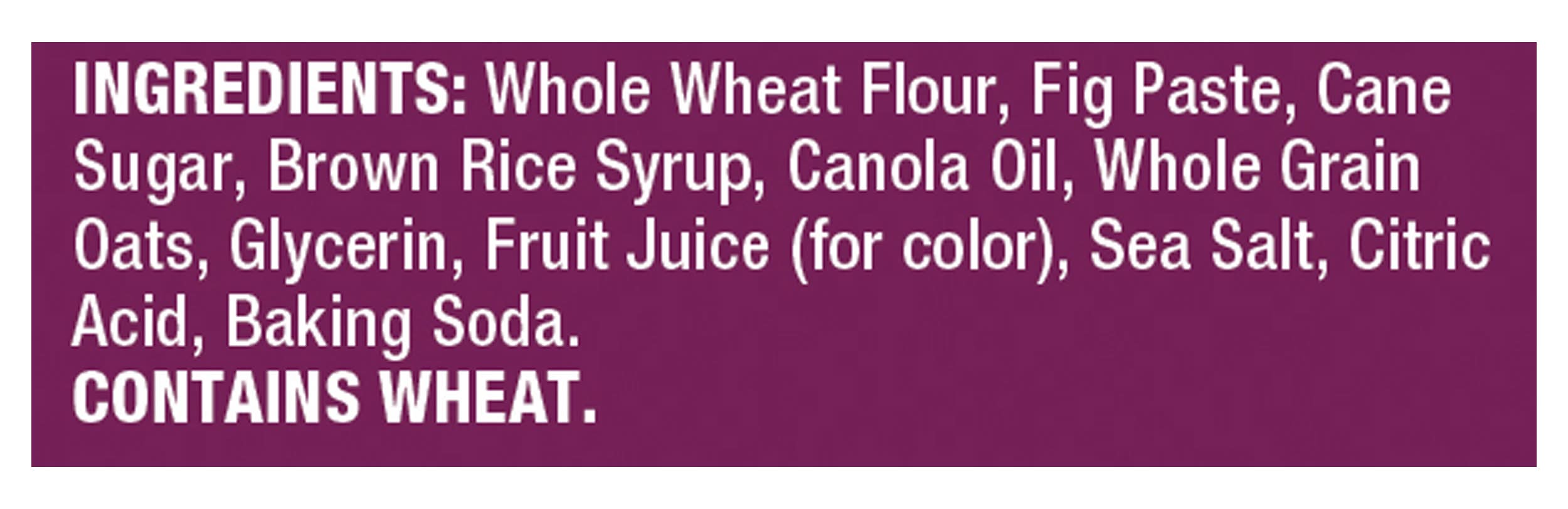 Ingredients: Whole Wheat Flour, Fig Paste, Cane Sugar, Brown Rice Syrup, Canola Oil, Whole Grain Oats, Glycerin, Fruit Juice (for Color), Sea Salt, Citric Acid, Baking Soda Contains: Wheat, Oat