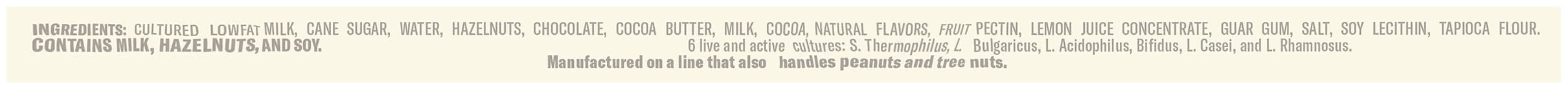 Ingredients: Cultured Lowfat Milk, Cane Sugar, Water, Hazelnuts, Chocolate, Cocoa Butter, Milk, Natural Flavors, , Fruit Pectin, Lemon Juice Concentrate, Guar, Salt, Soy, Lecithin, Tapioca Flour, 6 Live and Active Cultures: S. Thermophilus, L. Bulgaricus, L. Acidophilus, Bifidus, L. Casei and L, Rhamnosus Contains: Milk, Tree Nuts, Hazelnuts/Filberts, Soybeans, Peanuts, Tree Nuts