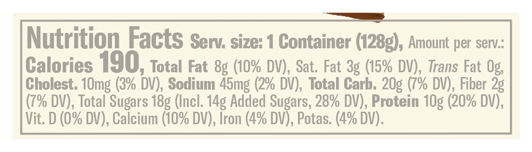 Chocolate hazelnut flavored lowfat greek yogurt with hazelnuts & milk chocolate. Gluten-free. Made with milk from cows not treated with rBST. Milk from rBST-treated cows is not significantly different. Flavor: Chocolate hazelnut