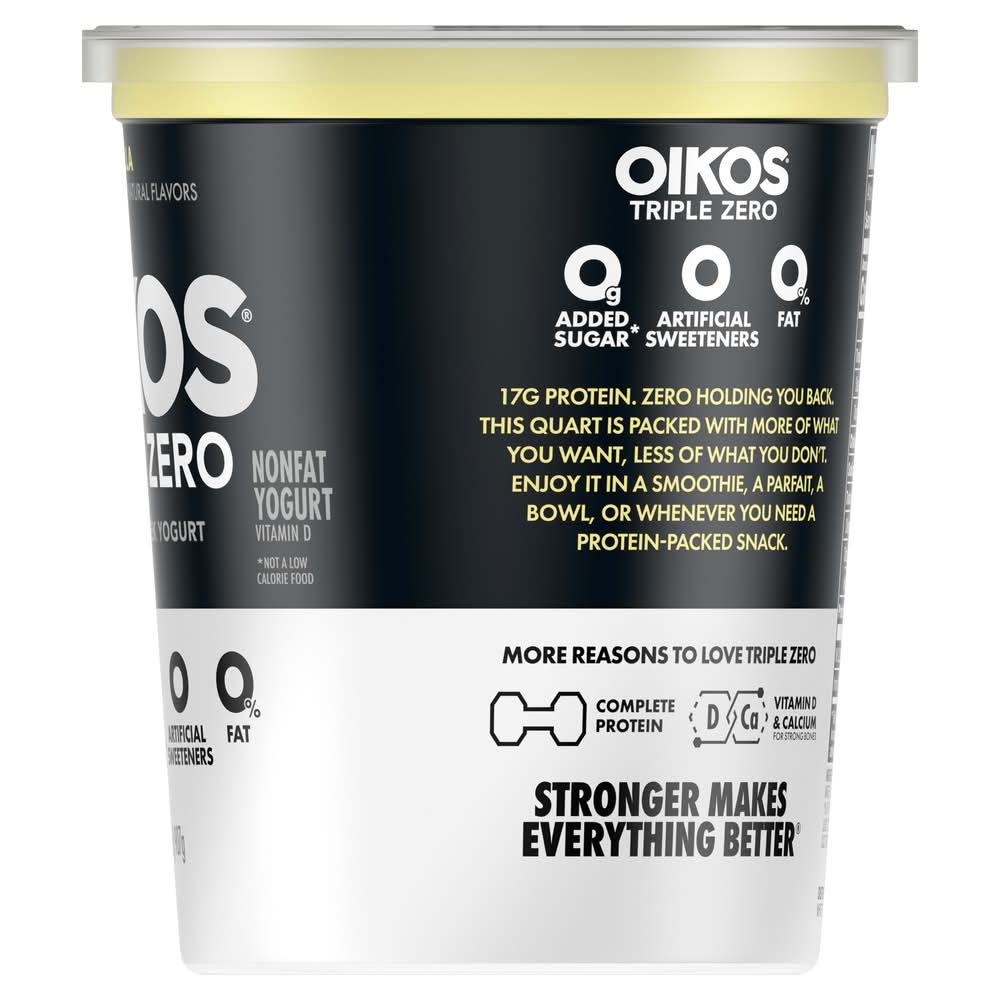 Enjoy epic tastes with Triple Zero Nonfat Greek Yogurt, the delicious nonfat Greek yogurt tub with more of what you want and less of what you don’t. so you can always have dependable, high protein snacks with zero holding you back. Because when you feel strong, you are unstoppable. With protein and deliciousness, this Greek nonfat yogurt can help you strive to reach your potential. Protein is important - an essential nutrient that we need in our diet - and Oikos Triple Zero yogurt tubs are great tasting, convenient solutions for adding complete protein every day. Pack a Greek yogurt serving for days that start at a sprint and enjoy a delicious boost of protein at lunch. • Flavor: Vanilla • Danone US, LLC, White Plains, NY, 10605 • Packaging: Reusable