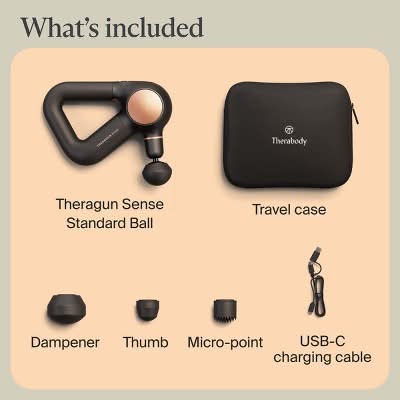 Theragun Sense massge gun features relaxing massage therapy scientifically proven to relieve aches and pains, ease soreness, reduce stress and help you sleep better. Take the guesswork out of your treatments with an LCD screen that acts as your personal guide, displaying easy to follow step-by-step massage and breathwork routines directly on the device. Choose from 5 preloaded routines, or personalize them to fit your needs by swapping and saving your favorite routines from the Therabody app. Plus, build daily stress-relieving habits with an immersive breathwork experience in the Therabody app featuring 3 visually-guided breathwork routines, relaxing TheraMind sound therapy and haptic vibration cues directly on the device. Whisper-quiet, lightweight and equipped with our patented triangle grip so you can easily reach anywhere on your body, Theragun Sense makes it easy to create an effective, personalized wellness routine. HSA/FSA eligible purchase. Science-Backed Benefits: • Relieve Aches & Pains • Ease Soreness • Reduce Stress • Sleep Better What’s Included: • Theragun Sense massage gun • 4 massage attachments (Standard Ball, Dampener, Thumb, Micro-Point) • USB-C charging cable • Travel pouch Color: Black
