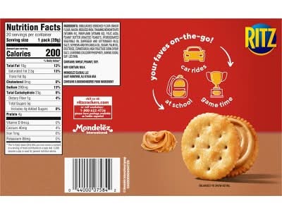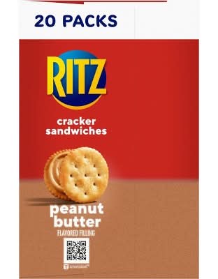 20 pack containing 6 sandwiches each. Ritz Peanut Butter Sandwich Crackers feature a flavored peanut butter filling. Each serving, equivalent to one package, contains 200 calories, 2.5 grams of saturated fat, which is 13% of the daily value; 290 milligrams of sodium, also 13% of the daily value; and 4 grams of added sugars, making up 8% of the daily value. The product includes bioengineered food ingredients and offers six sandwich crackers per package, suitable for enjoyment during various activities. • Flavor: Peanut butter • Pack size: 20 • Packaging: Reusable