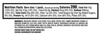 Ingredients: INGREDIENTS: UNBLEACHED ENRICHED FLOUR (WHEAT FLOUR, NIACIN, REDUCED IRON, THIAMINE MONONITRATE [VITAMIN B1], RIBOFLAVIN [VITAMIN B2], FOLIC ACID), PEANUT BUTTER (ROASTED PEANUTS, HYDROGENATED VEGETABLE OIL [RAPESEED AND COTTONSEED OILS], SALT), SOYBEAN AND, OR CANOLA OIL, SUGAR, PALM OIL, DEXTROSE, CORNSTARCH, HIGH FRUCTOSE CORN SYRUP, SALT, LEAVENING (CALCIUM PHOSPHATE, BAKING SODA), SOY LECITHIN.CONTAINS: WHEAT, PEANUT, SOY.MAY CONTAIN: MILK. Contains: CONTAINS: WHEAT, PEANUT, SOY.MAY CONTAIN: MILK.