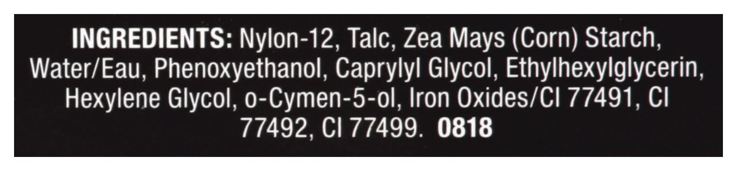 Ingredients: Nylon-12, Talc, Zea Mays (Corn) Starch, Water/Eau, Phenoxyethanol, Caprylyl Glycol, Ethylhexylglycerin, Hexylene Glycol, o-Cymen-5-ol, Iron Oxides/CI 77491, CI 77492, CI 77499