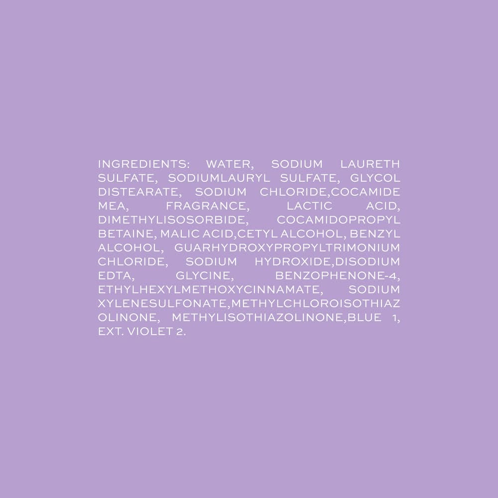Ingredients: Water, Sodium Laureth Sulfate, Sodium Lauryl Sulfate, Glycol Distearate, Sodium Chloride, Cocamide MEA, Fragrance, Lactic Acid, Dimethyl Isosorbide, Cocamidopropyl Betaine, Malic Acid, Cetyl Alcohol, Benzyl Alcohol, Guar Hydroxypropyltrimonium Chloride, Ext. Violet 2, Sodium Hydroxide, Disodium EDTA, Glycine, Benzophenone-4, Ethylhexyl Methoxycinnamate, Blue 1, Sodium Xylenesulfonate, Methylchloroisothiazolinone, Methylisothiazolinone.