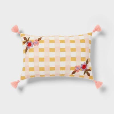 Pillowfort Checkered With Flower Embroidery Kid's Decorative Pillow, Yellow