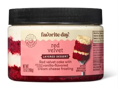 Satisfy your sweet tooth with this Red Velvet Layered Dessert from Favorite Day™, your ready-to-eat personal layer cake in a jar! Featuring red velvet cake with vanilla-flavored cream cheese frosting, it's an on-the-go snack that's neater than a cupcake. It makes an ideal, deliciously indulgent dessert for enjoying anywhere — on the couch, at the office, or while traveling or commuting Favorite Day™: A little bliss in every bite. Guaranteed to be a favorite or your money back. Flavor: Vanilla