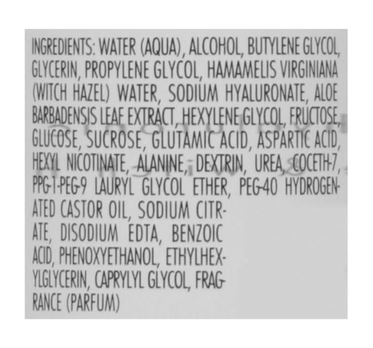 Ingredients: Water (Aqua), Alcohol, Butylene Glycol, Glycerin, Propylene Glycol, Hamamelis Virginiana (Witch Hazel), Water, Sodium Hyaluronate, Aloe Barbadensis Leaf Extract, Hexylene Glycol, Fructose, Glucose, Sucrose, Glutamic Acid, Aspartic Acid, Hexyl Nicotinate, Alanine, Dextrin, Urea, Coceth-7, PPG-1-PEG-9 Lauryl Glycol Ether, PEG-40 Hydrogenated Castor Oil, Sodium Citrate, Disodium EDTA, Benzoic Acid, Phenoxyethanol, Ethylhexylglycerin, Caprylyl Glycol, Fragrance (Parfum)