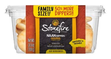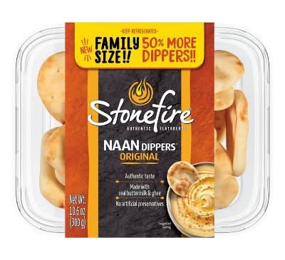 Re-invent your snacks and appetizers & more. They may be bite-sized but they're still Stonefire® Naan. Delightful bite-sized naan that is baked in our patented high heat oven that creates an amazing taste & texture you notice on first bite. Stonefire® Family Pack Original Naan Dippers are made with fresh buttermilk and ghee (clarified butter) and the right amount of bubbles and char. Give your family and friends a whole new way to enjoy their favorite dips and spreads. Kids love them too. Be creative and create bite-sized PB & J sandwiches, grilled cheese, naanchos, and bite-sized pizzas. Stonefire® Family Pack Original Naan Dippers® are the perfect, pillowy, snack-sized flatbread for any time of day or occasion. Keep Refrigerated.