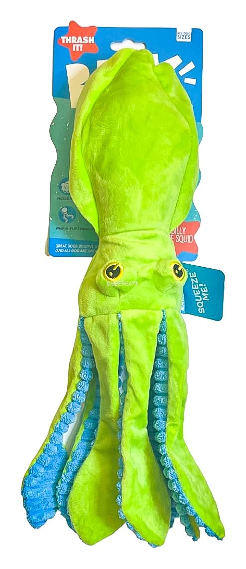 "Let the squid games begin with this cephalopod dog toy. We're looking for some quick paws to outdraw Billy The Squid's whip-n-flip tentacles. Grab ahold until you hear Billy squeak and then get the fluff out of there. Only suckers get attached. Is your dog ready to dive Under the Seams? This BARK Original is perfect! Made by dog people, for dogs and their people, backed by BARK's Happiness Guarantee." Color: Green