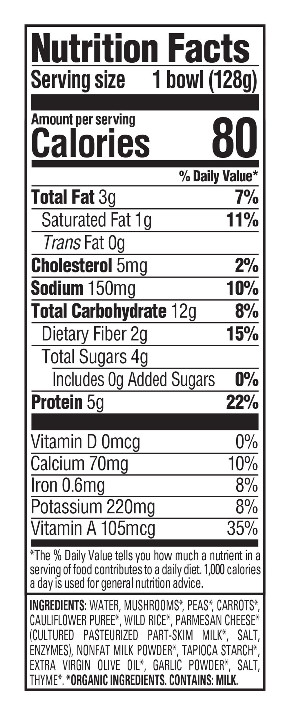 Ingredients: WATER, MUSHROOMS*, PEAS*, CARROTS*, CAULIFLOWER PUREE*, WILD RICE*, PARMESAN CHEESE* (CULTURED PASTEURIZED PART-SKIM MILK*, SALT, ENZYMES), NONFAT MILK POWDER*, TAPIOCA STARCH*, EXTRA VIRGIN OLIVE OIL*, GARLIC POWDER*, SALT, THYME*. *ORGANIC INGREDIENTS. Contains: MILK