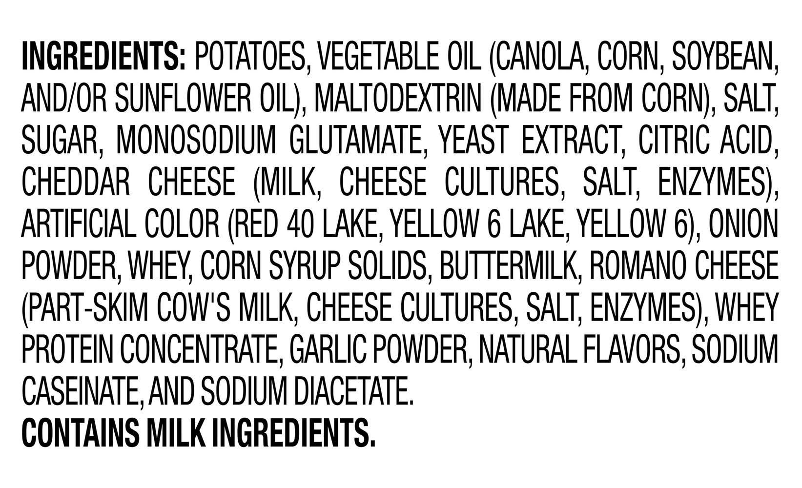 Ingredients: Potatoes, Vegetable Oil (Canola, Corn, Soybean, and/or Sunflower Oil), Maltodextrin (Made from Corn), Salt, Sugar, Monosodium Glutamate, Yeast Extract, Citric Acid, Cheddar Cheese (Milk, Cheese Cultures, Salt, Enzymes), Artificial Color (Red 40 Lake, Yellow 6 Lake, Yellow 6), Onion Powder, Whey, Corn Syrup Solids, Buttermilk, Romano Cheese (Part-Skim Cow's Milk, Cheese Cultures, Salt, Enzymes), Whey Protein Concentrate, Garlic Powder, Natural Flavors, Sodium Caseinate, and Sodium Diacetate Contains: Milk, Corn, Soybeans